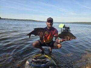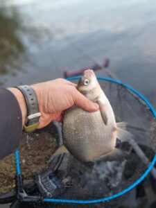 Iki aušros dar gera valanda, bet apie bręstančius rimtus reikalus išduoda kiek labiau nei įprastai pakylėti mūsų balsai ir marių pakrantėmis nuaidintis suktuku maišomo jauko garsas. Akivaizdu, kad marios gyvos – žuvies tikrai daug. Kažkur smarkiau pliūkšteli salatis, po kojomis pakrančiui verda mailiaus kolonijos bei matyti vienas kitas baltos žuvies paliekamas ratilas kiek tolėliau. Persimetame keliais žodžiais apie pagrindinį dienos planą – Aivarą nusprendžiame nuskriausti ir įkurdinti tarp mudviejų su Simonu. Jauko akcentai – pas visus bazė VDE, tačiau Simonas savo jauką kiek pasaldinęs, o mudu su Aivaru bandome savo prievilą išryškinti migdolo ir slieko kvapais (vadinamomis „aromomis“). Gylis žvejojamu atstumu nemenkas (8-9 metrai), todėl bent jau aš saviškį jauką kiek perdrėkinu, kad kuo mažiau jo pasklistų viršutiniuose ir viduriniuose vandens sluoksniuose. Vis dėlto spėju, kad tai galėjo būti viena iš mano tos dienos klaidų. Jau po žvejybos Simonas užsiminė, kad jo jaukas, pasiekęs dugną, formavo gražų „debesį“, tuo tarpu maniškis moliu gulė ant dugno. Dideliam karšiui ir srovei ši jauko ruošimo prieiga visai tiktų, bet stovinčiam Kauno marių vandeniui veikiausiai tai nėra geriausias sprendimas. Spėtina, kad optimaliau parinkti tokį jauką, kuris, visų pirma, visa savo mase pasiektų dugną ir tada kažkuria dalimi „užsikurtų“ – suformuotų kad ir nedidelį, tačiau aiškiai matomą jauko debesį. Ir tai nebuvo vienintelė tos dienos įžvalga.