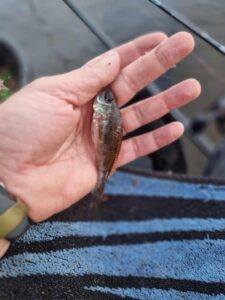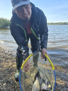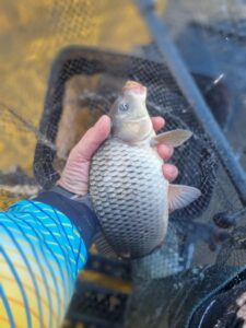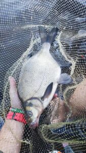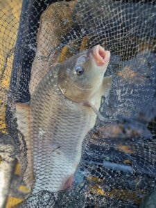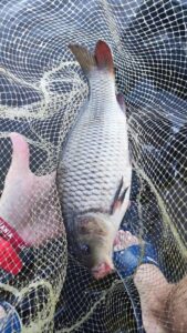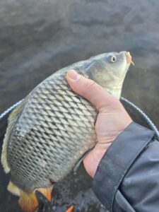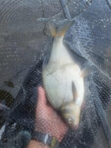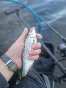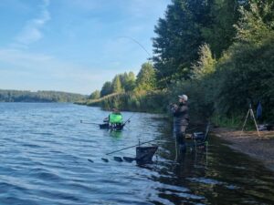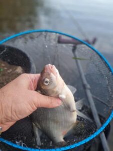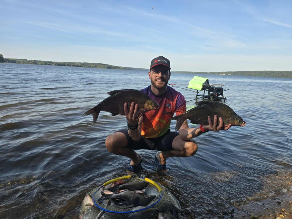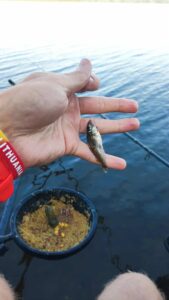 Startuojame septintą ryto. Žuvies daug ir ji atsiliepia itin greitai. Užbėgant įvykiams šiek tiek už akių, būtų galima konstatuoti, kad visa žūklės eiga atitiko Stevo Ringerio nurodytą įprastinį scenarijų – aktyvi ir rezultatyvi pradžia, sulėtėjusios ir apsunkusios žūklės valandos po intensyvios pradžios ir sunkios kūrybinės kančios išprovokuojant pavienes žuvis žūklės pabaigoje. Pirmieji ant kabliukų veriasi puskaršiukai (iki 500 gr.). Aiškiai matyti, kad rytinės puotos metu žuviai nelabai rūpi nei jauko receptūros, nei aromatizatoriai, nei pavadėlių ilgiai, nei kabliukų dydžiai. Masalams žuvis taipogi ne pernelyg išranki – ant kablio dvi trys musės lervos, keletas trūklių, galbūt dar pinkutė ar kasteris paįvairinimui. Tiesa, visi trys pasirenkame startuoti kone tose pačiose distancijose (~40 m), kur minkštą dugną laipsniškai pradeda keisti aštrėjanti „tarka“. Kad turėtume daugiau alternatyvų, visi susirandame ir po tolimąjį tašką, į kurį bus galima lėkti, jei kaimynas pernelyg įsismarkaus ir paliks visus kitus be žuvies. Bet kol kas apie tai galvoti per anksti – karšiukai godžiai ir be jokių didesnių kaprizų čiumpa kabliuką, todėl belieka tik mėgautis žūkle.