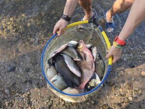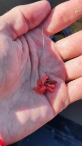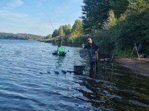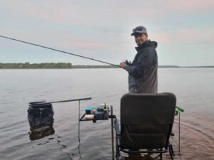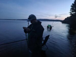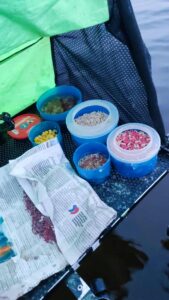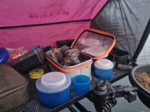 Atslūgus pradiniam laukiančios žūklės entuziazmui, pereita prie paruošiamųjų darbų. Mudu su Aivaru sutarėme susibėgti iš vakaro, gurkštelėti vieną kitą šlakelį sodresnio gėrimo ir kartu apgalvoti laukiančius reikalus. Visų pirmą suvertėme krūvą pačių įvairiausių jaukų likučių ir susidėliojome receptūras (visą šitą reikalą nufilmavome). Aivaro akcentas – vanduo pakankamai dar šiltas, todėl turėtų veikti vasaros realijos. Aš savo ruožtu pasirinkau tamsesnį jauką ir eksperimento dėlei šliūkštelėjau į bendrą košę šiek tiek žuvies miltų (vadinamojo „fish meal‘o“). Mintis paprasta – jei sėdėsime trise petys į petį, būtina imtis skirtingos taktikos (o jauko parinkimas yra neatsiejamo jos dalis), kad eilinįsyk galėtume išmokti ko nors nauja ar verifikuoti kažkurias „senas tiesas“. Gyvi masalai? Ant kablio tebūnie – musės lervos ir trūkliai, o į jauką kasteris, maltos musės lervos, pinkutės, sliekai ir galbūt trūkliai (bet kur kas saikingiau). Visa ši pradinė klausimo prieiga keisis tik tuomet, jei paaiškės, kad žuvis absoliučiai neaktyvi ir nepermaldaujama.