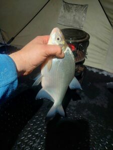 Na o dabar apie pačios žūklės rezultatus. Karšėkai, nors ir ne ištisai, bet kibo. Kad ir didžiųjų nesulaukėme, bet veiksmo buvo per akis. Didžiausia žuvis – gal apie 1 kg., o dauguma – vadinamieji sportininkai (500-700 gr.). Iš viso pasilabinti iš eketės išlindo 24 karšiokai. Jaukinom tarkuotomis muslervėmis su „jokeriu“, viską užkamšant juodu neutraliu jauku. Ant kabliuko geriausiai jautėsi trys musės lervos, o trūklys buvo praktiškai ignoruojamas.