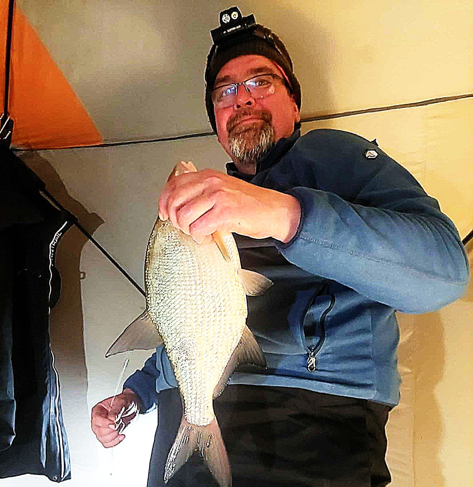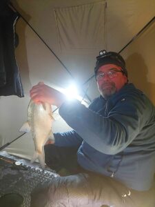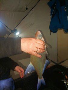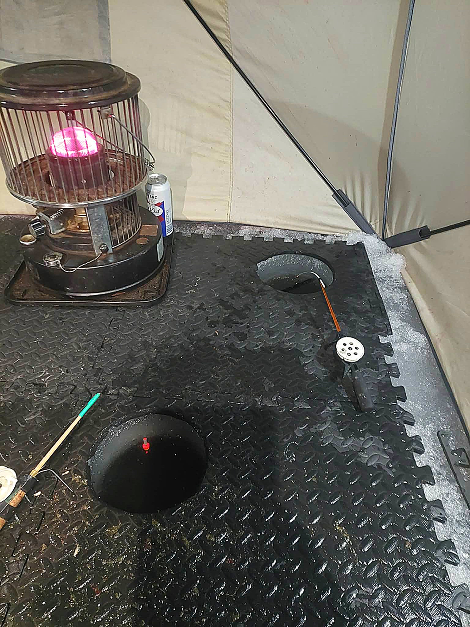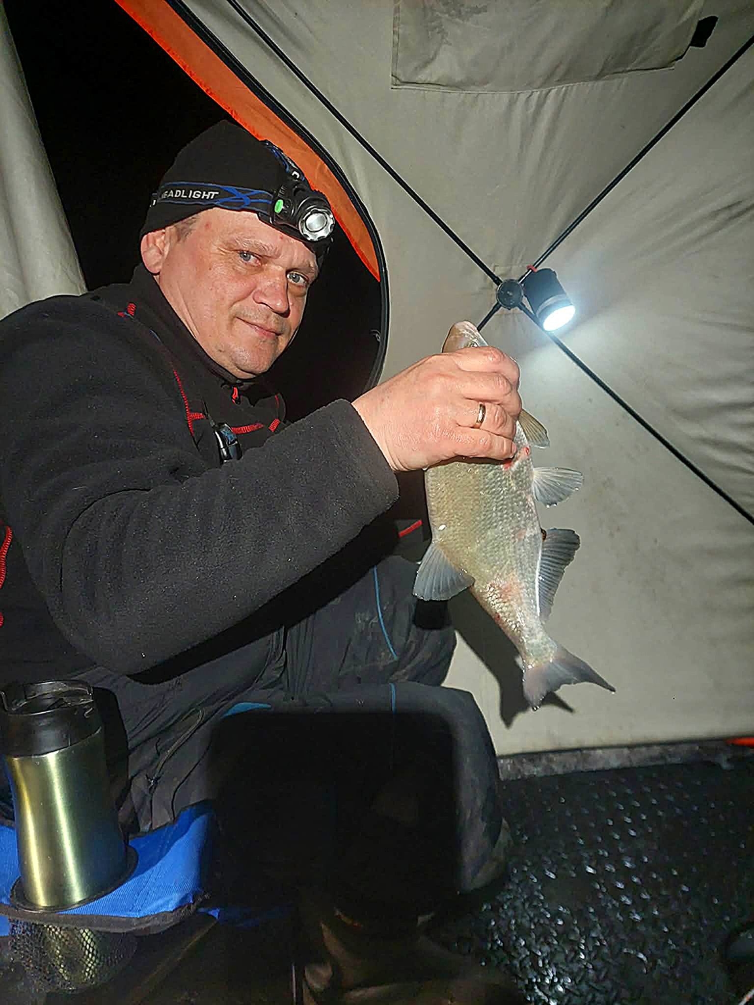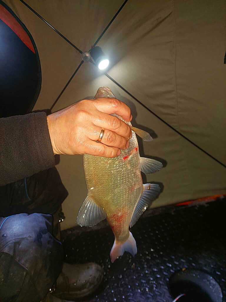 Sulaukiu kolegos net iš Jonavos, kuriam prieš akis pirmoji gyvenime žvejybinė naktis palapinėje ant ledo. Man pačiam kiek neramu dėl būsimų reikalų – juk nesinori pakviesti svečią be reikalo ir išleisti tuščiomis. Laimei šįkart Kauno marios svečią priėmė pagal etiketą – nepašykštėjo dosnių vaišių ir šou programos. Oras pasakiškas – jokio vėjo ir lengvas pliusas. Vienas juokas tokiomis sąlygomis pasistatyti palapinę – svarbiausia jokio rankų šalimo.
