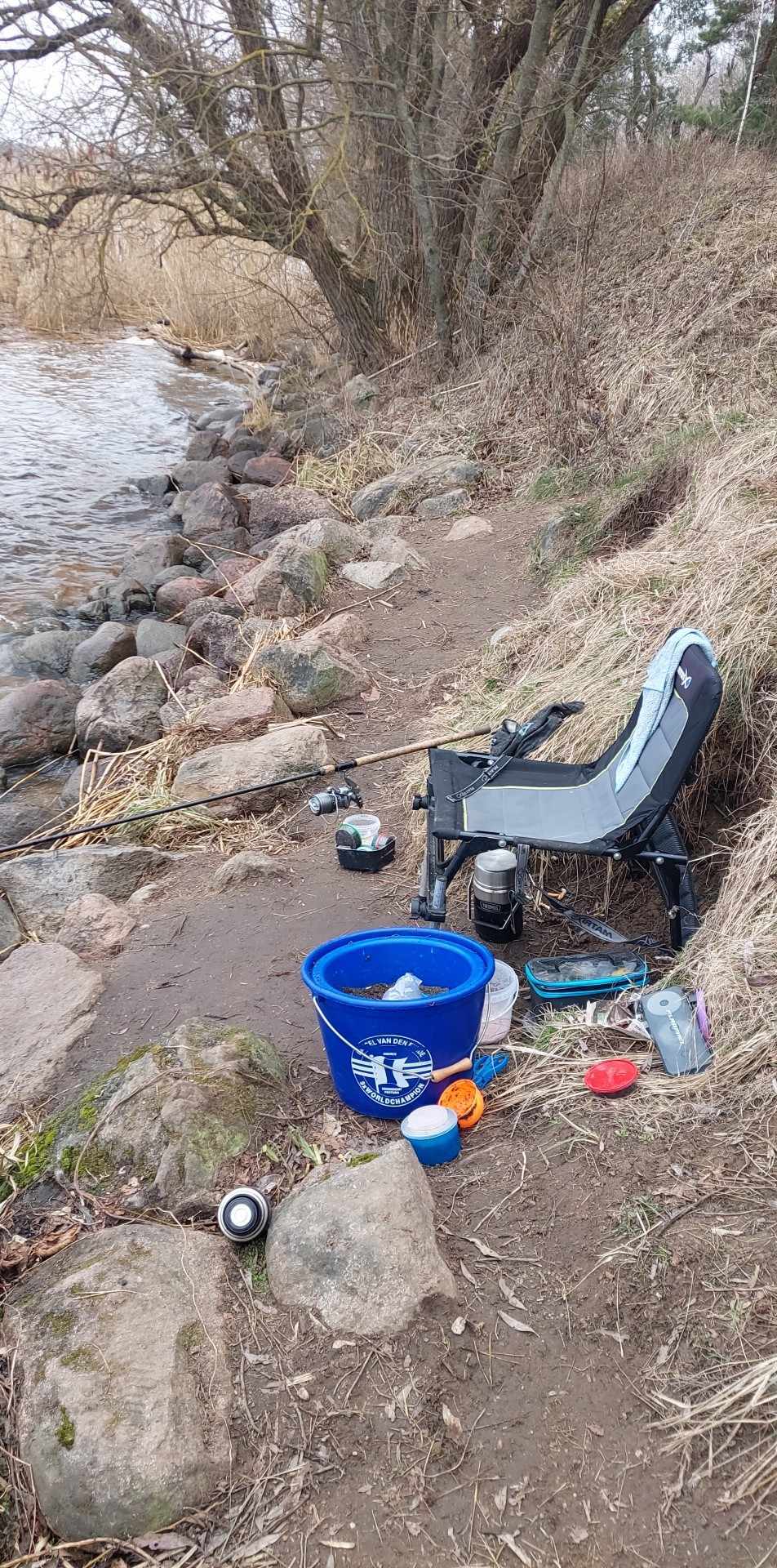 Greitai ir netikėtai sutarėm su „Šiandien kimba“ kolektyvu pakartot žvejybą Kauno mariose, tik šįkart nuo kranto. Kaip ir žiemą ruošiantis poledinei žūklei, viskas prasidėjo nuo mažos velniavos. Kadangi išsiruošėm ne savaitgalį, sakiau, ramiai rasim vietų Kapitoniškėse. Mane, pasukusį iš pagrindinio kelio, aplenkė ralistas. Nulėkė vietos užsiimti, Vanagas atsiprašant. Pasirodo, ne be reikalo. Pilna automobilių, visos geriausios vietos užimtos. Randu vietą, kur šiek tiek toliau vaga. Pasidaro aišku, kad reiks mesti, labai toli mesti! Akmenuotas skardis, bet, ačiū Dievui, vietiniai hobitai kėdėms skardyje urvus iškasę.