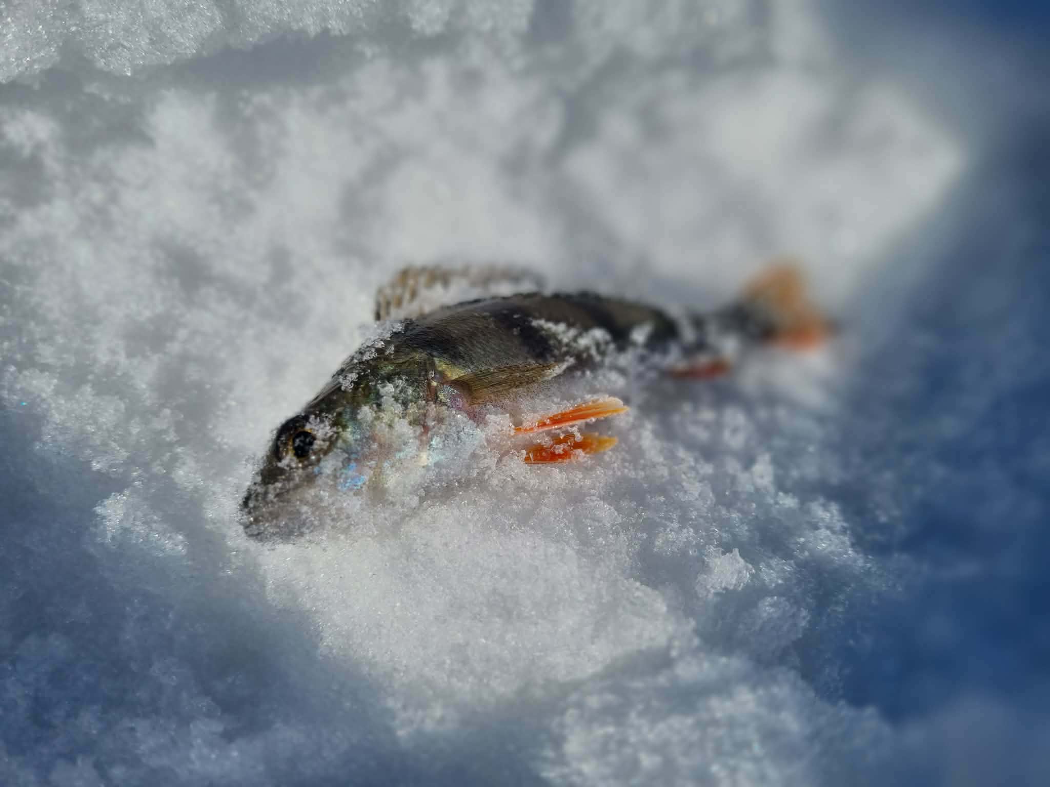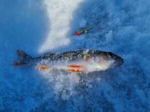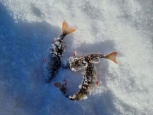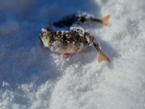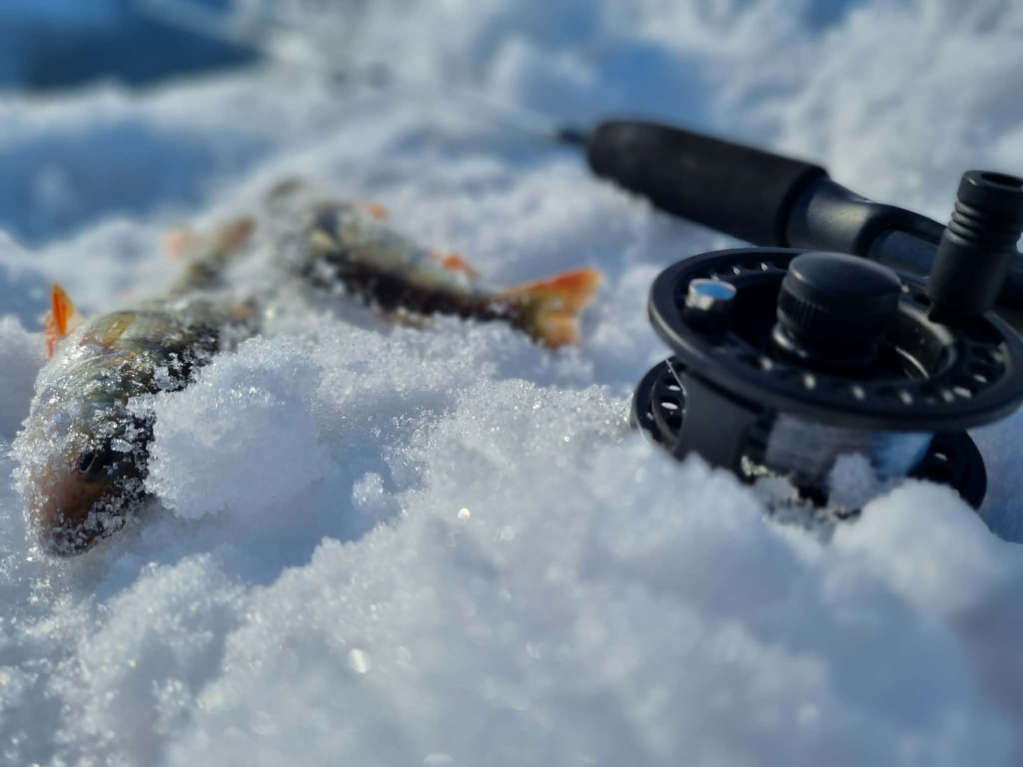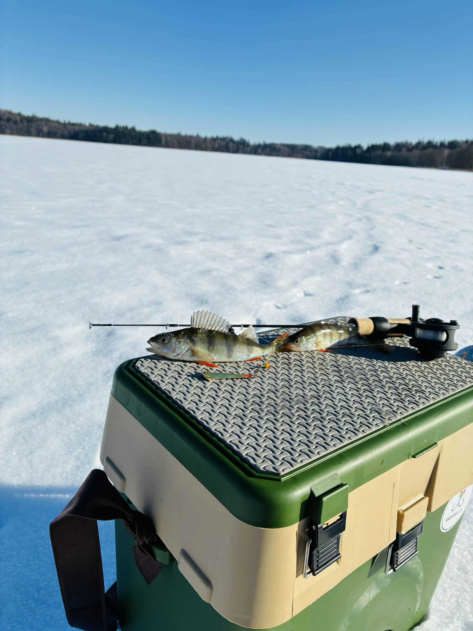 Na o kol kas du vienodais kostiumais vilkintys vyriokai skuba ledu pirmųjų orientacinių taškų link. Pati ežero struktūra įprastinė – visa batimetrinė dugno struktūra „bliūdo“ formos. Giliausia ežero vieta pačiam jo vidury siekia arti 30+ metrų. Mintis ieškoti žuvies ties priekrante, kur nuo kranto linijos vanduo gana greit gilėja ežero vidurio link. Mūsų pasirinktam gaudomam ruože gylis svyruoja nuo 3 iki 6 metrų. Šiandien gaudomi išimtinai tik blizgutėmis ir švytuoklėmis. Buvo minties pričiupti ir avižą, tačiau man asmeniškai su ja gaudyti smagu iki 3 metrų. Kad ir šaltis pakenčiamas, tačiau didesniame gylyje visai kitoks avižos vedimas (jos reikia sunkesnės) ir dažnai pinasi plonas valas. Su blizgute viskas šimtąkart paprasčiau. Be to, tokiu žūklės būdu gali patikrinti kur kas didesnį plotą, o šis faktorius pirmąsyk gaudant naujam vandens telkiny gali būti itin svarbus. Banaliai sakant, pirmiausia reikia rasti pačią žuvį, o tik tada galima galvoti, kaip ją lengviau privilioti.