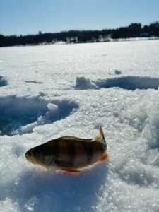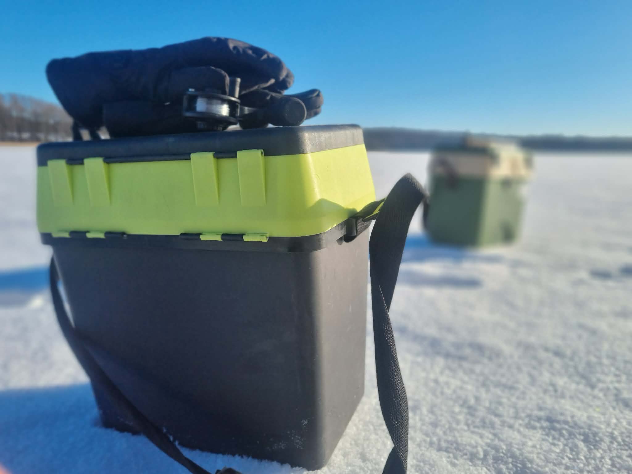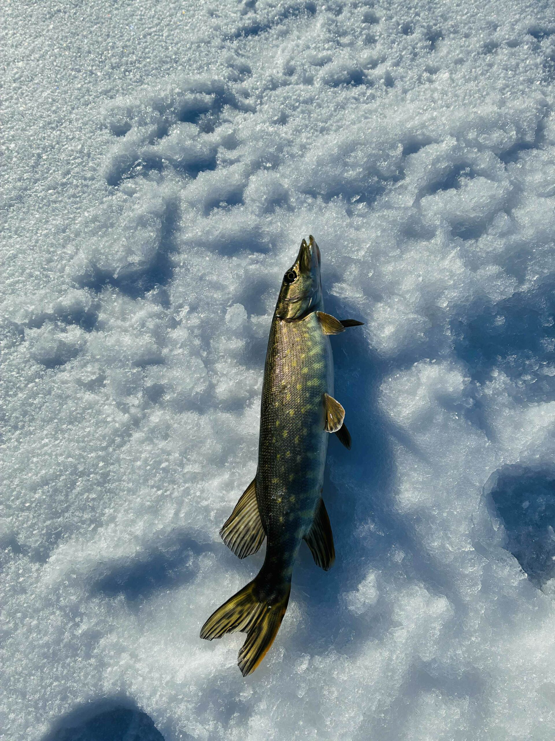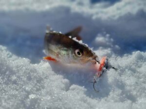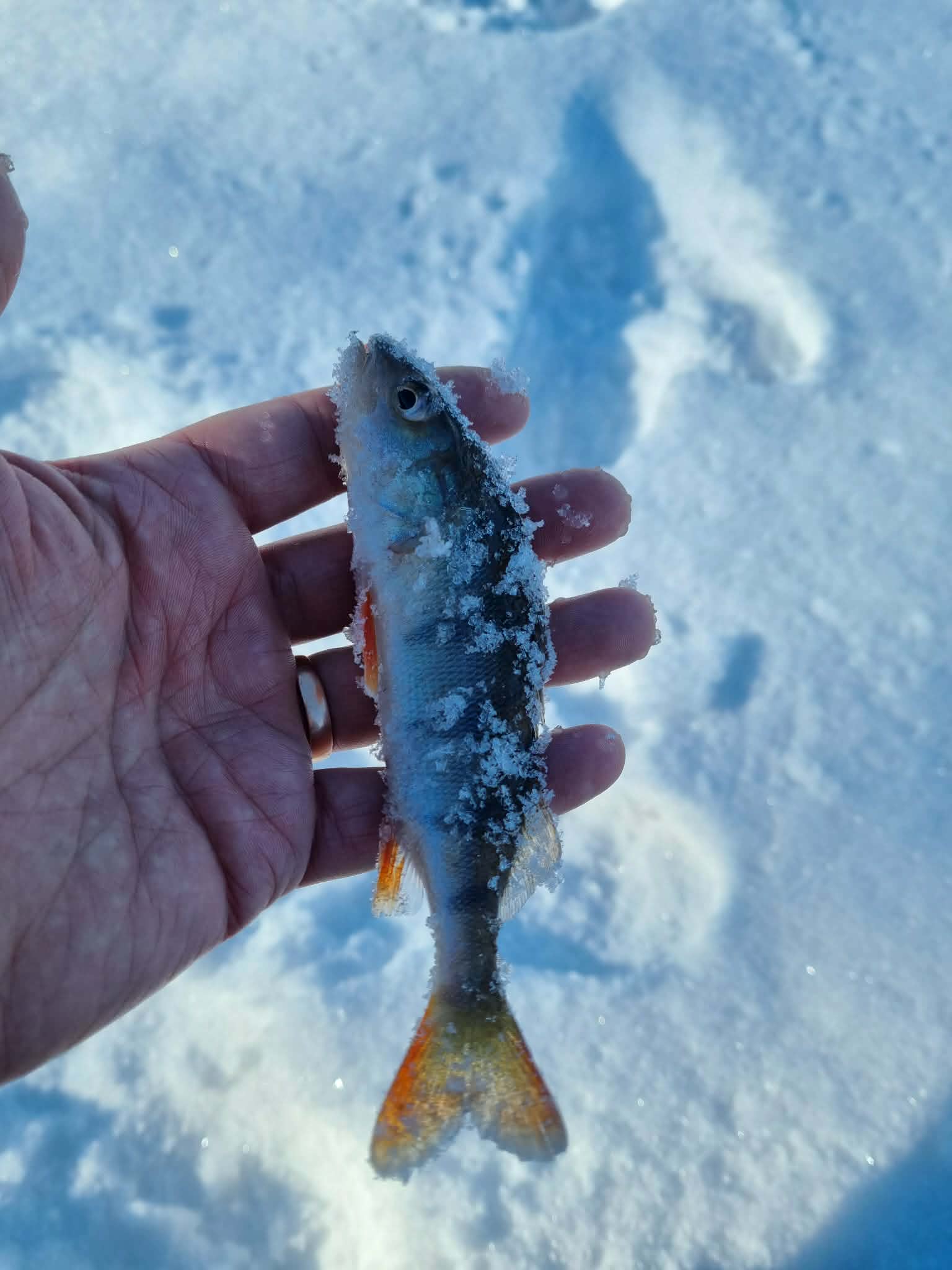 Na o kol kas du vienodais kostiumais vilkintys vyriokai skuba ledu pirmųjų orientacinių taškų link. Pati ežero struktūra įprastinė – visa batimetrinė dugno struktūra „bliūdo“ formos. Giliausia ežero vieta pačiam jo vidury siekia arti 30+ metrų. Mintis ieškoti žuvies ties priekrante, kur nuo kranto linijos vanduo gana greit gilėja ežero vidurio link. Mūsų pasirinktam gaudomam ruože gylis svyruoja nuo 3 iki 6 metrų. Šiandien gaudomi išimtinai tik blizgutėmis ir švytuoklėmis. Buvo minties pričiupti ir avižą, tačiau man asmeniškai su ja gaudyti smagu iki 3 metrų. Kad ir šaltis pakenčiamas, tačiau didesniame gylyje visai kitoks avižos vedimas (jos reikia sunkesnės) ir dažnai pinasi plonas valas. Su blizgute viskas šimtąkart paprasčiau. Be to, tokiu žūklės būdu gali patikrinti kur kas didesnį plotą, o šis faktorius pirmąsyk gaudant naujam vandens telkiny gali būti itin svarbus. Banaliai sakant, pirmiausia reikia rasti pačią žuvį, o tik tada galima galvoti, kaip ją lengviau privilioti.