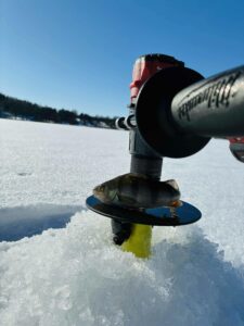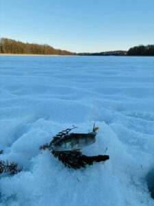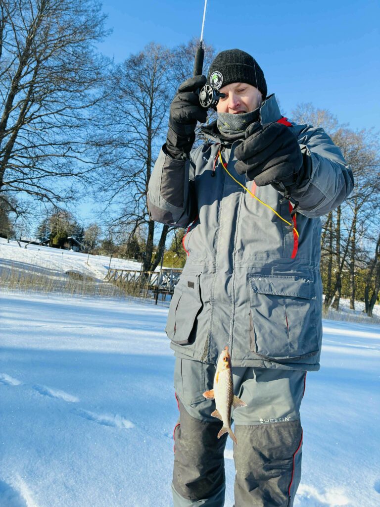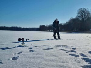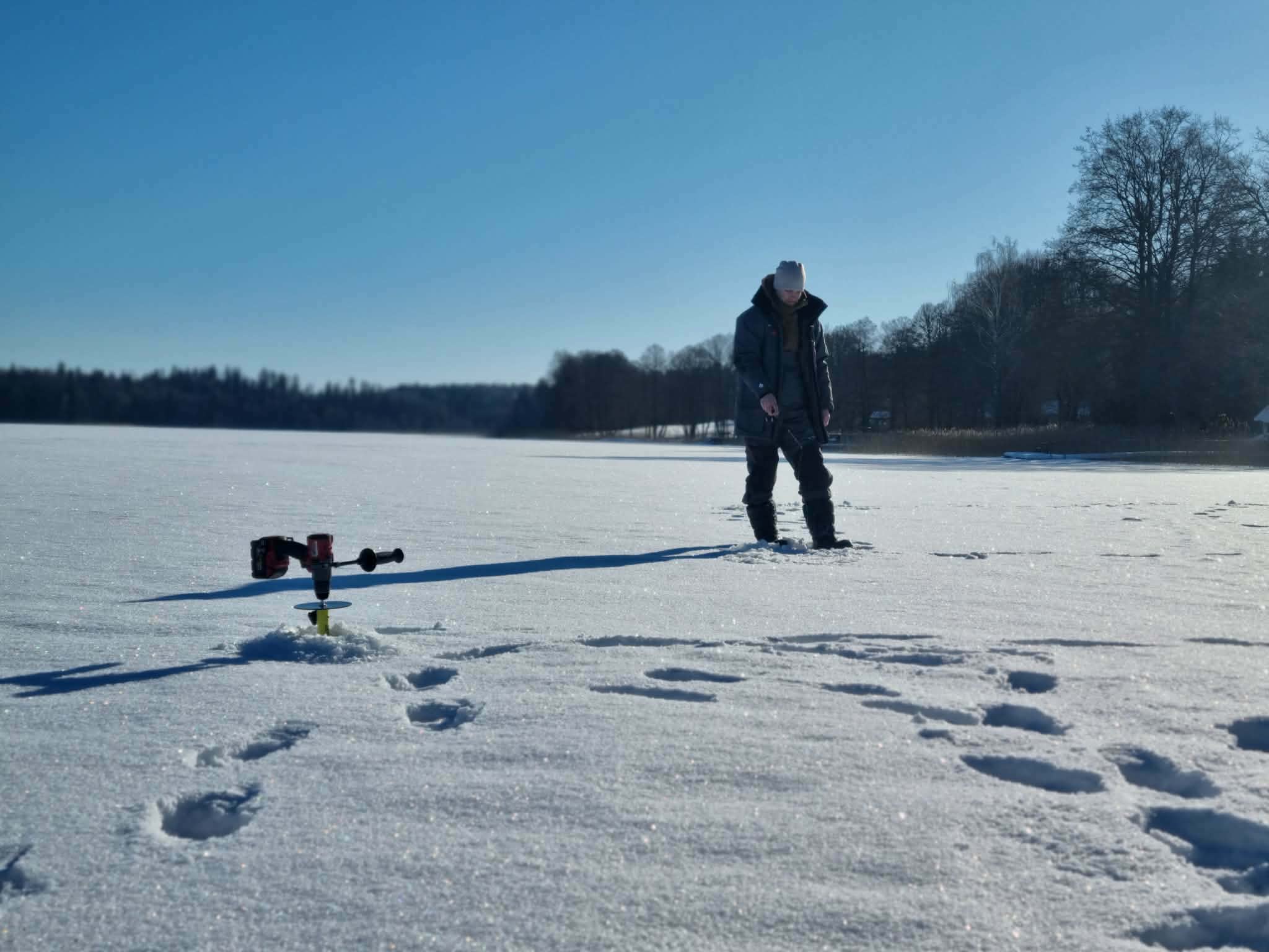 Pragręžta gal arti šimto ekečių rankiniu grąžtu. Tai bene didžiausias mano dienos pasiekimas, nes ledo storis kone pusė metro. Užsisėdėjusiam prie kompiuterio miesčioniui toks įšūkėlis tikrai į naudą. Galiausiai baigiamojoje žūklės stadijoje susibėgam su Augustu, jis papasakoja apie savo lydekas, aš apie savąją ir pamažu pradedame žvalgytis namo.