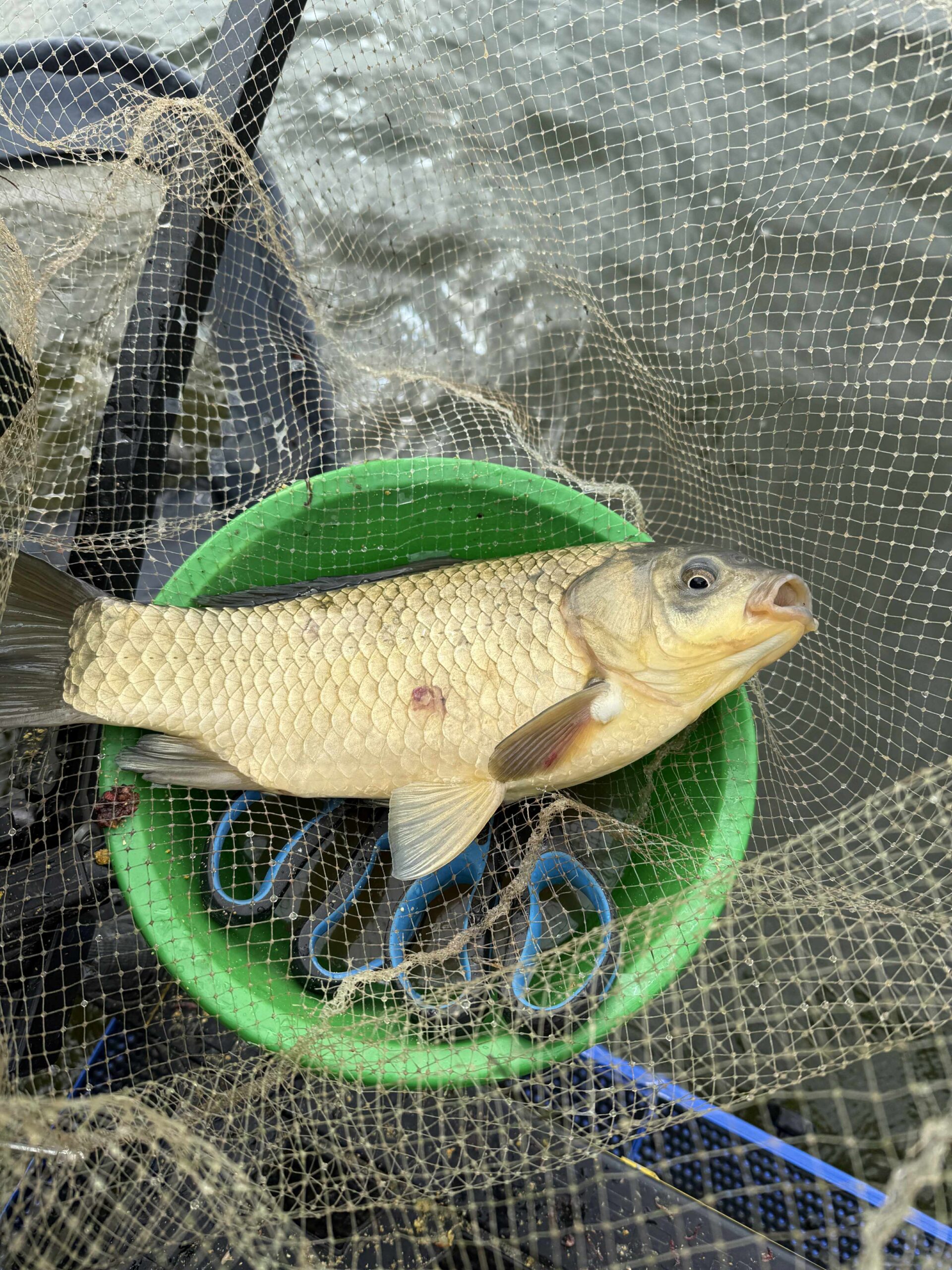 Po kurio laiko pasirodo pirmieji maži karšiukai, vos delno dydžio. Vadinasi, jiems patiko tai, ką pasiūliau – trūkliai. Kibimas kibimu, bet aš tikrai ne šių mažylių čia atvažiavau. Galiausiai sulaukiu pikto ir išraiškingo kibimo. Smūgis toks, kad akimirksniu nelieka kabliuko. Ko gero, bus karpiukas ar karosas pasidarbavęs. Išsprendęs problemą, po kurio laiko sulaukiu dar vienos pikto smūgio, bet šį kartą pavyksta pričiupti kaltininką. Traukdamas suprantu, kad tai tikrai ne plačiašonis. Žuvis eina šonu, tad bus nelegalaus dydžio karpiukas ar karosas. Ir štai rezultatas! Karosas ar Karpiukas? Spręskite patys! Aš jį pavadinau hibridu.