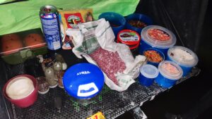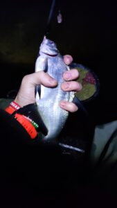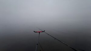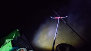 Susiruošiu savo sostą, išglostau gyvus, visiškai laiko nevejamas ir nespaudžiamas, kaip tas ežiukas rūke, pasiruošiu žvejybos vietą ir apšvietimą. Mintis dar sutemose pradėti žūklę. Gal ir čia, kaip Nemune, didieji mėgsta tamsą? Prasiskanuoju dugną jau žinomais atstumais, kad susirasčiau gylio pokyčius ar kokią dugno anomaliją. Tolimą tašką klipsuoju ties 63, artimąjį – ties 38 metrais. Pasikabinu šviestuvą stalui, taip pat stovą su „powerbank“ ir Giedriaus (ačiū Jam už tai) dovanotą USB lemputę, kuri puikiai apšviečia meškerių viršūnes minimaliomis elektros sąnaudomis. Kadangi baisiai smelkia rūkas ir drėgmė, sunku rasti kitam krante orientyrą tamsoje, tad pasikliaudamas tik savo jėgomis ir patirtimi – „sušaudau“ 10 šėryklų į tolimąjį tašką gausiai trūkliais ir kasteriu prisodrintu jauku. Tuo tarpu į artimąjį tašką kur kas kukliau – tik 6 šėryklos. Mintis tokia, kad tolimajam taškui dabar leisiu atsipūsti, o artimajame dirbsiu iš peties. Jeigu pamenate ankstesnių žūklių dinamiką, tai šiandienos lauktinas scenarijus turėtų būti toks – visų pirma, auštant žuvis turėtų suaktyvėti artimajame taške bent keletui valandų. Ar ši tendencija išliks ir atvėsus vandeniui – tuoj pat sužinosime. Tačiau jau iš pirmųjų indikacijų matyti, kad dėl atvėsusio vandens ir orų žuvies koncentracija ir aktyvumas brėkštant ženkliai sumažėję. Vaizdas visai kitas nei buvo ankstesnėse žūklėse. Na bet kol kas neskubėkime su galutinėmis išvadomis.