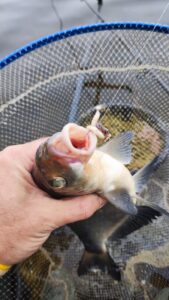 Kiek prieš pusę septintos atsiliepė vienas karšiukas, tačiau po jo – vėl tyla ir ramybė. Maža to, Kauno marių tolius nuklojo dar tirštesnis rūkas. Kiek praaušus, žuvis akvatorijos kiek sujudo. Atsirado gyvybės ir taške. Deja, ji visai kitokia nei buvo ankstesniais kartais. Prisilietimai, patempimai, neužtikrinti kibimai. Trumpai tariant – nervų tampymas. Daugelis porins, kad pirmoji pagalba esant tokiai situacijai – ploninamas pavadėlis ir mažinamas kabliukas. Taip ir padariau, tačiau kibimai nepasitaisė. Ši nepasiteisinusi taktinė gudrybė kainavo man saują nupjautų pavadėlių…