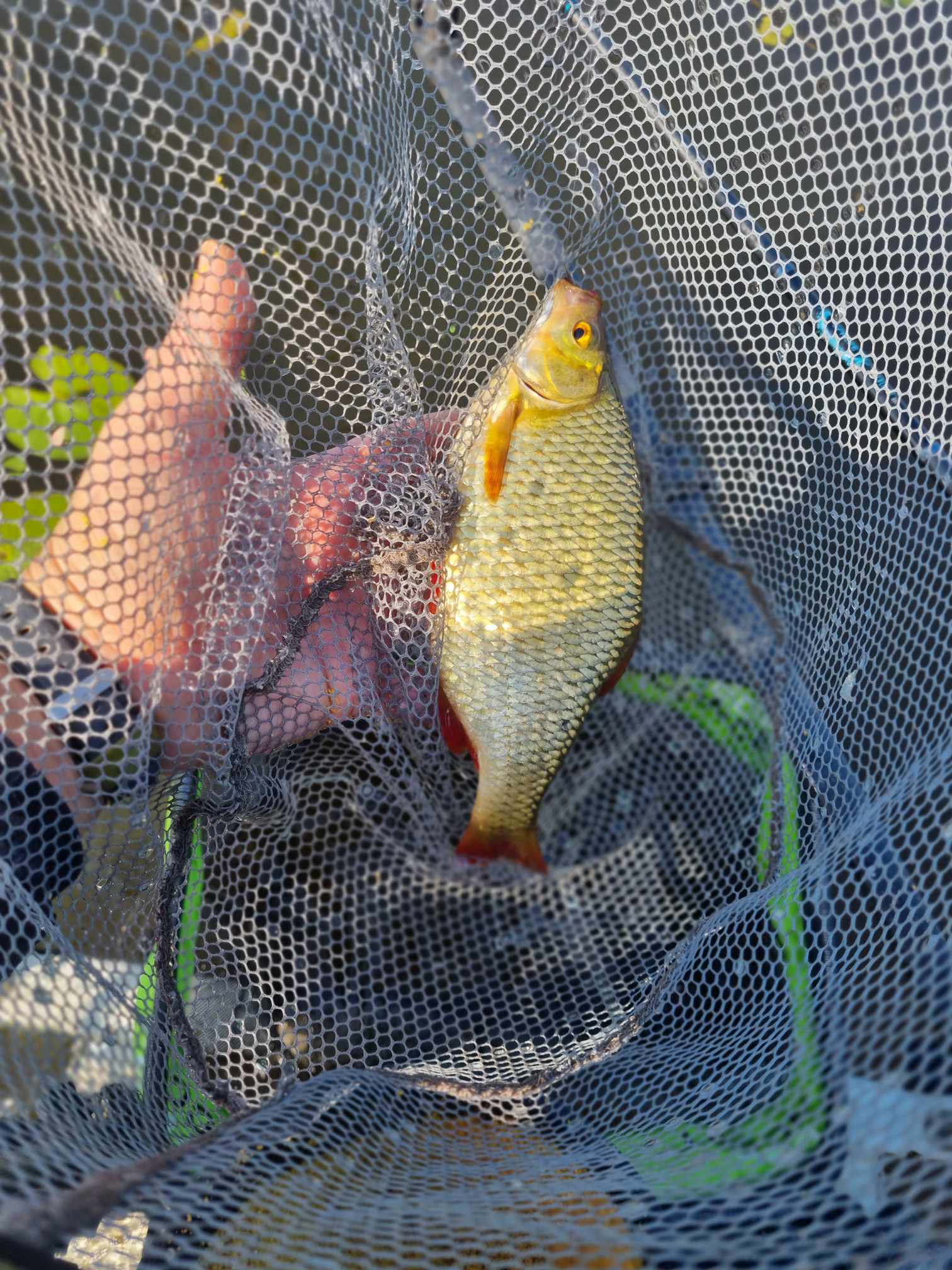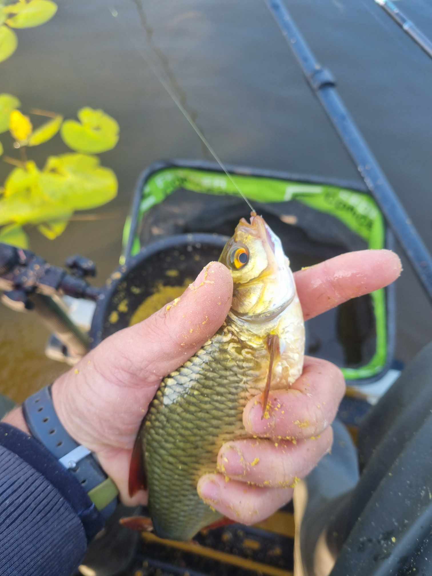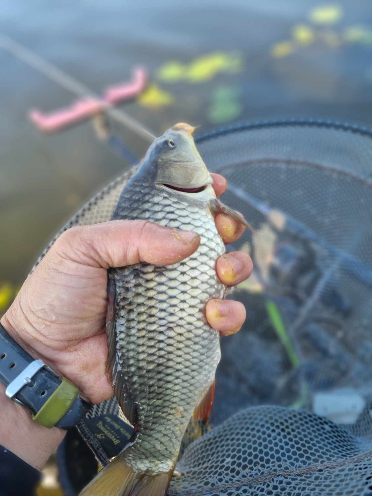 Pirmasis, kaip visada, pasirodo angelas sargas pūgžlys. Po jo iškart paseka nedidelė kuojytė. Ką gi, veiksmo jau yra, pradžia klasikinė, tad belieka išlaukti pasirodančių karšių. Trečias metimas ir super aštrus kibimas (deja, nerealizuotas). Nieko panašaus į smulkmenišką prisilietimą. Negi būsiu pataikęs karšiams ant galvos? Paskubomis užtaisau naują feederinę salvę ir švysteliu atgal į tašką. Vėl žvėriškas smūgis – pakertu! Toks jausmas, kad nedidelis karosiukas būtų anam gale. Pritraukiu prie graibšto – ir štai pirmoji dienos staigmena! Kur buvęs, kur nebuvęs į nekviestų svečių sąrašą įsiprašo delninis karpiukas. Ką gi, greita nuotrauka (kadangi sietui toks karpiokas dar per mažas) ir paleidžiu mažylį atgal. Vos spėju iš naujo užmesti ir vėl ta pati ataka. Dar vienas karpiukas! Nors iš sportinės perspektyvos, visai smagus reikalas taip nenuobodžiauti, bet vis dėlto ne to aš čia atvažiavau.
