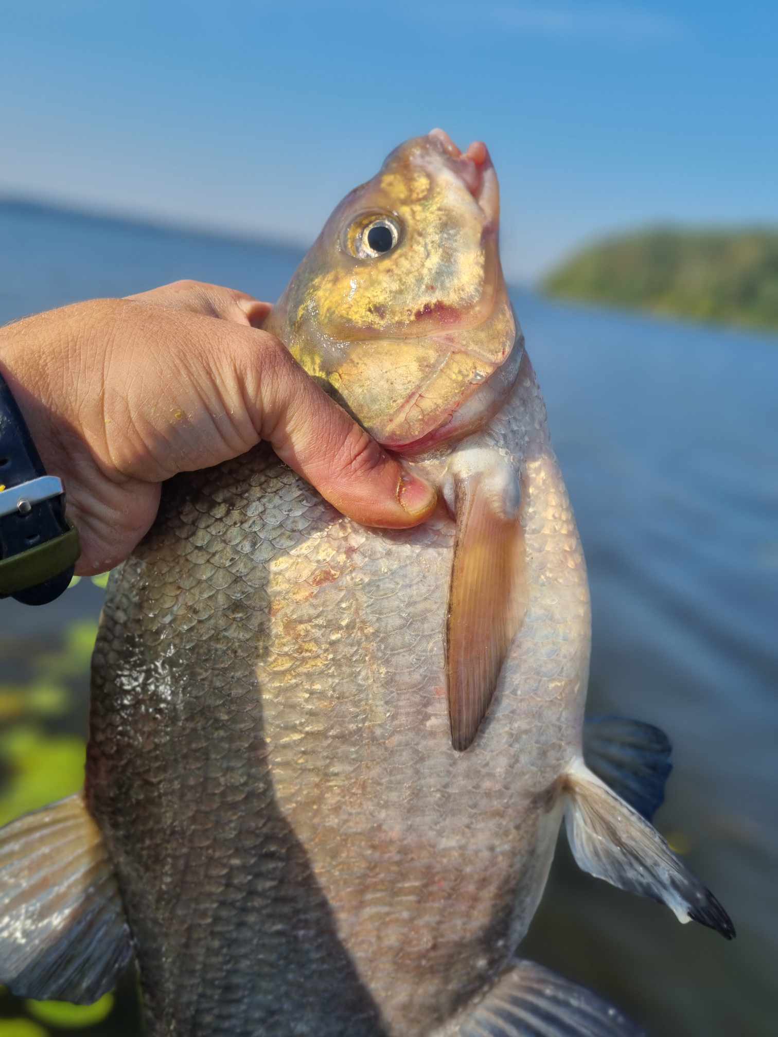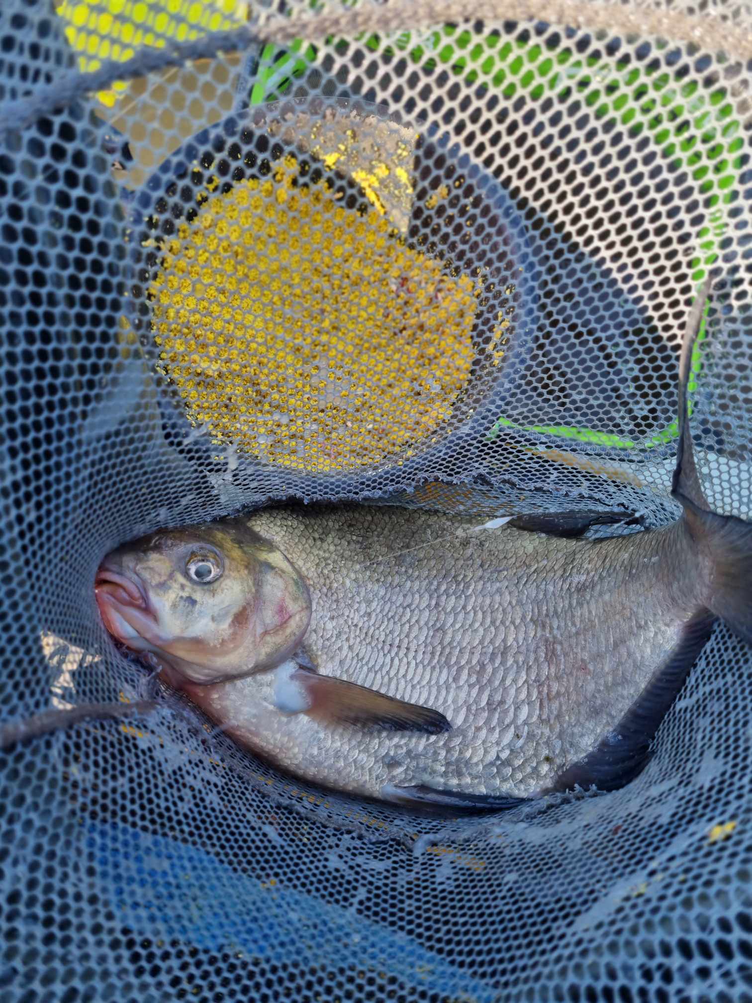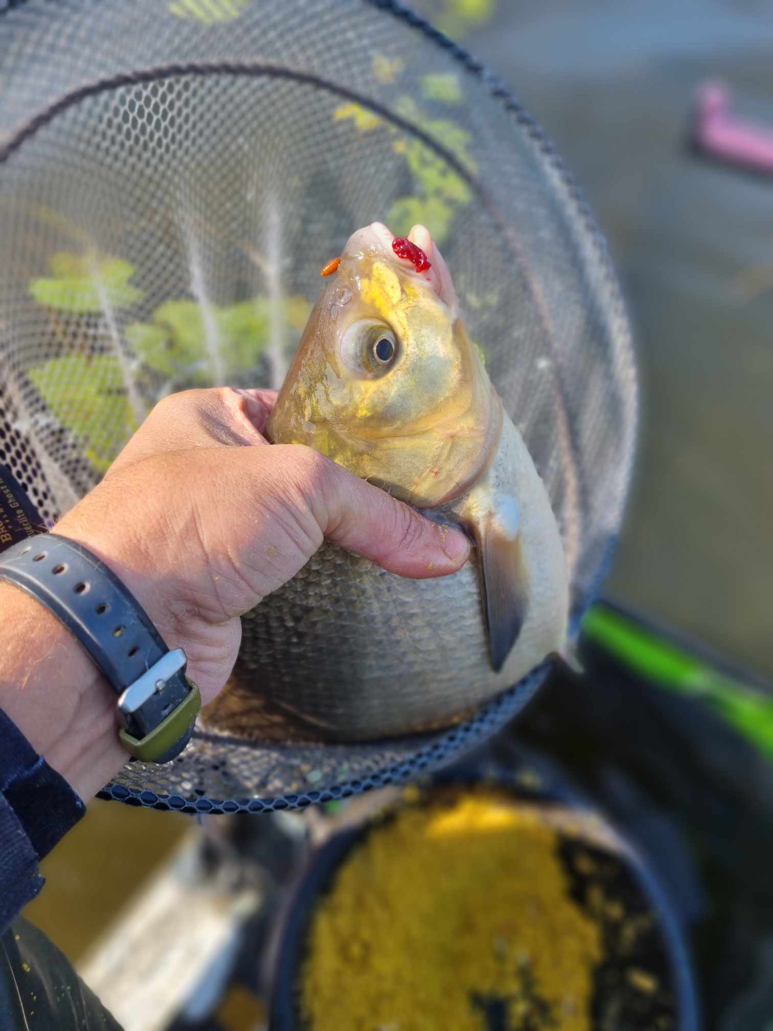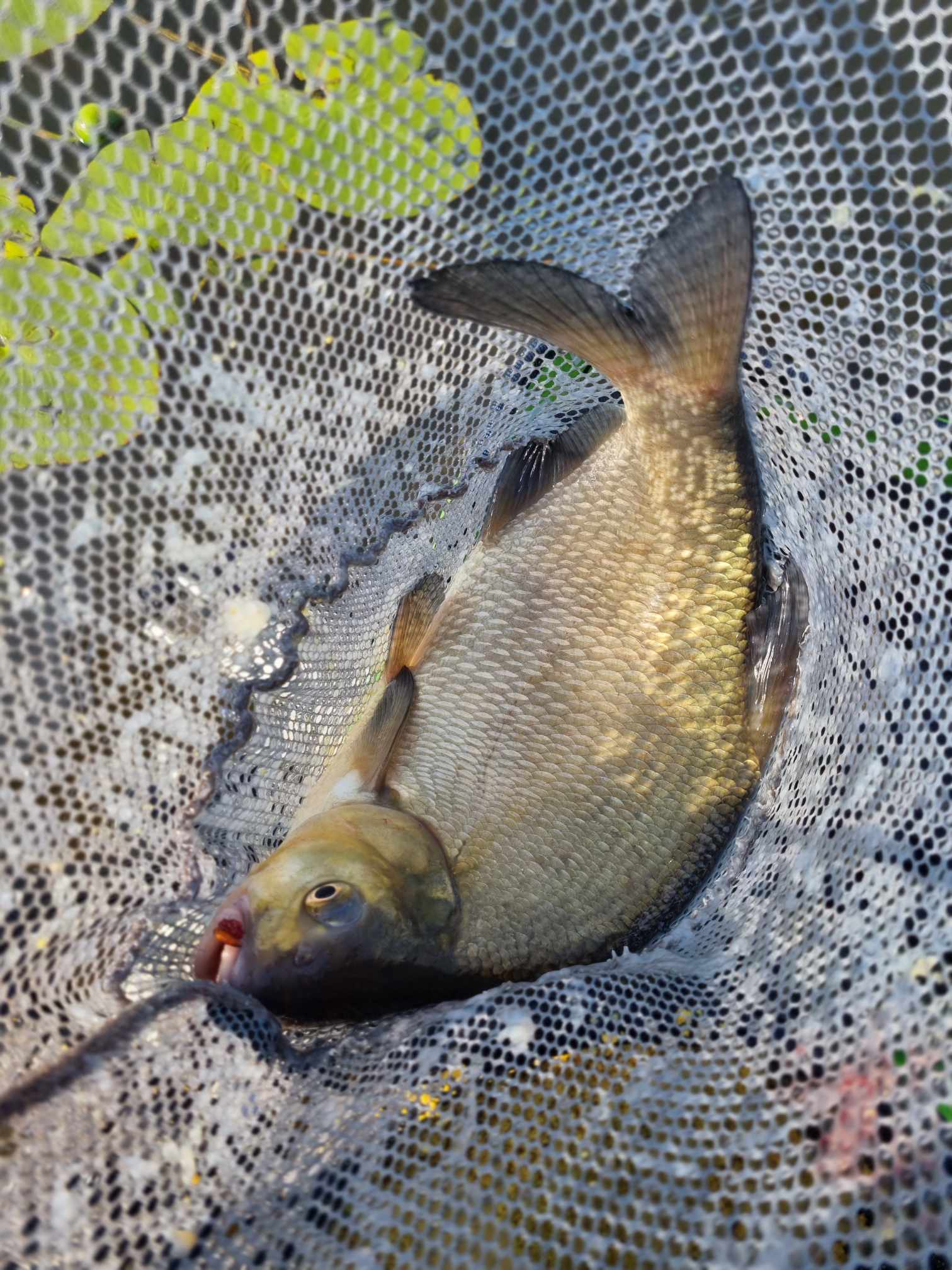 Pirmasis, kaip visada, pasirodo angelas sargas pūgžlys. Po jo iškart paseka nedidelė kuojytė. Ką gi, veiksmo jau yra, pradžia klasikinė, tad belieka išlaukti pasirodančių karšių. Trečias metimas ir super aštrus kibimas (deja, nerealizuotas). Nieko panašaus į smulkmenišką prisilietimą. Negi būsiu pataikęs karšiams ant galvos? Paskubomis užtaisau naują feederinę salvę ir švysteliu atgal į tašką. Vėl žvėriškas smūgis – pakertu! Toks jausmas, kad nedidelis karosiukas būtų anam gale. Pritraukiu prie graibšto – ir štai pirmoji dienos staigmena! Kur buvęs, kur nebuvęs į nekviestų svečių sąrašą įsiprašo delninis karpiukas. Ką gi, greita nuotrauka (kadangi sietui toks karpiokas dar per mažas) ir paleidžiu mažylį atgal. Vos spėju iš naujo užmesti ir vėl ta pati ataka. Dar vienas karpiukas! Nors iš sportinės perspektyvos, visai smagus reikalas taip nenuobodžiauti, bet vis dėlto ne to aš čia atvažiavau.