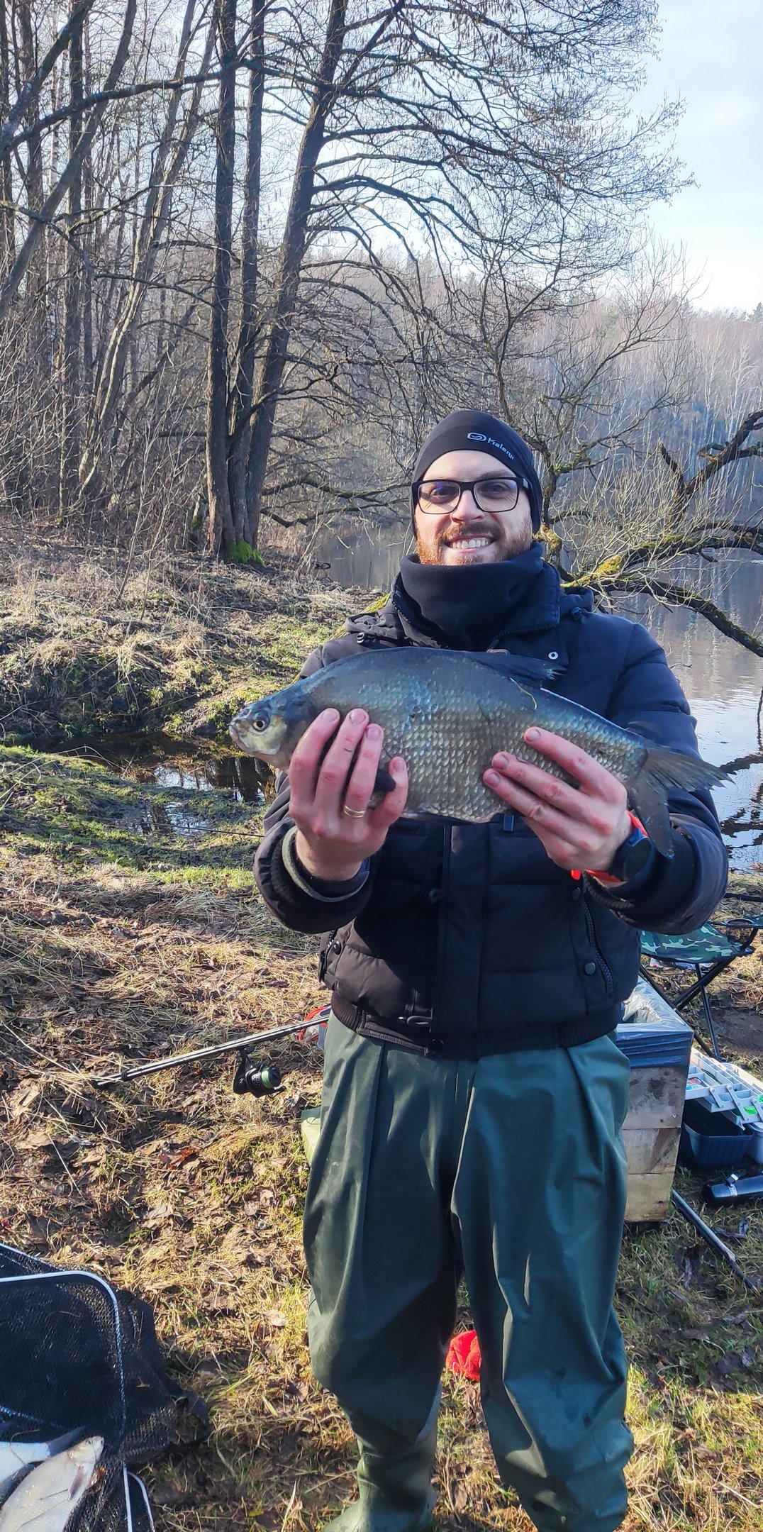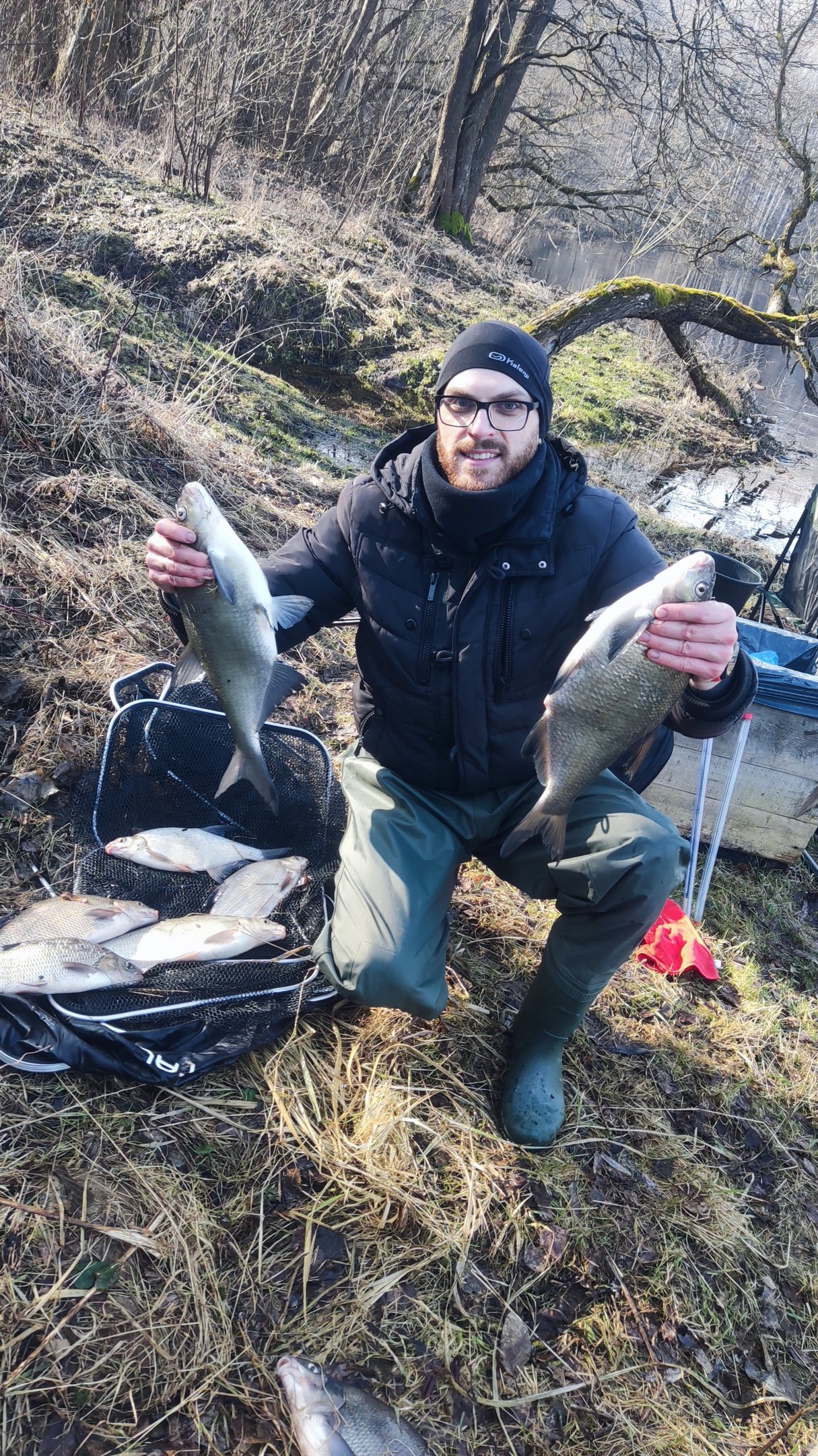 Kovo 1 diena, darbo pabaiga, prasuku pro žvejybos parduotuvę gyvų masalų ir jauko ir namo ruoštis rytdienai. Viduj tas malonus jaudulys – pagaliau, pagaliau užsimesi ir lauksi to galūnėlės virpėjimo, lingavimo. Ankstus kovo 2 dienos rytas. Į vietą atvažiuota dar prietemoje. Išmokta pamoka nuo ano pavasario – užsidėjau bridkelnes, mat, pirma pažintis su ta vieta padovanojo pilną batą vandens. Ir nesuklydau, nes, norėdamas pasiekti žūklavietę, keliskart turėjo bristi vandeniu. O jis – kosmiškai pakilęs! Gylio dar daugiau nei šiltuoju metų laiku, bet grįžtanti srovė ir ramuma kažkur giliai viduje audžia mintį, kad kažką pagausiu. Pasiruošiu dvi meškeres. Viena iš jų kone nauja, įsigyta praeito sezono pabaigoj ir tik kartą išbandyta ežere siaučiant didžiuliam vėjui. Pamaniau, kad bus gera proga išbandyti ją čia tolimai distancijai palei pagrindinę srovę. Startuoju 07:00, pasirenku vieną tolimą tašką prie pagrindinės srovės ir vieną artimą visai čia pat pakojui. Švysteliu po 5 šėryklas be priedų startui. Rišu pavadėlius, pakarpau musės lervų ir trūklių, dedu juos į jauką ir į šėryklą ir pirmyn. Laikmatis nustatytas kas 5 minutėms. Žiūrėsim ir lauksim, kas bus. Laikmatis įkyriai vis primena apie save, tačiau nieko. Galop 07:45 keistai agresyvus kibimas, pakertu, žuvis yra, traukiu – nesuprantu, kokia tai žuvis. Pamatau – gražuolė meknė! Galvoje šmėkšteli greita mintis, kad pastaroji atsitiktinai užkibo praplaukdama, turbūt tuo ir teks pasitenkinti šiandien. Bet vis vien smagu! Taip kartodamas, kaitaliodamas išlaukimus 5–10 min intervalais, sukdamas galvą, kokias kombinacijas mauti ant kabliuko, po pusantros valandos sulaukiu gražaus karšio kibimo, kurio su niekuo nesumaišysi. Pakertu – yra! Neapsakoma euforija, jėga, viduj laimės iki ohoho! Traukiu ir jaučiu, kad anam gale ne „faniera“, niuksi ir priešinasi rimtai. Po trumpos kovos krante atsiduria visai gražus karšiokas. Prabėga dar vienas pusvalandis su keliais pabarbenimais, bet nieko rimto. Niūros mintys, kaip visada, netrunka sugrįžti. Kaip ten bebūtų, bet nors vieną, visai smagų jau pagavau. Bet vos saulė pakilo aukščiau, vos oras sušilo labiau ir iškart prasidėjo, – kibimas sekė kibimą! Jei nesulauki kibimo per 5 minutes, neverta ilgiau laukti, trauki, kabini šviežią masalą, kemši šėryklą ir pirmyn. Kibo taip, kad kartais tekdavo numesti šalin ištrauktą meškerę ir kirsti užmestą. Deja, mano laiko ištekliai šiuosyk buvo riboti, todėl žūklę buvau priverstas baigti 10:30, nors reikalai, matėsi, judėjo tik geryn. Neperlenksiu lazdos pasakydamas, kad tai buvo pusantros valandos tikro „kaifo“, apie kurį net negalėjau pasvajoti. Tiesa, geresnė šįkart galėjo būti realizacija. Sakyčiau, ji galėjo siekti kokius 60 procentų, nes vieną žuvį nuleidau taške, kitą palikau ant kranto šlaito, visu savo grožiu atsivėrusio vandeniui nukritus. Pridėkime dar kelis nutrauktus pavadėlius ir atsikabinimus pakeliui. Iš viso 8 žuvys siete: 1 graži meknė ir ne ką prastesni 7 karšiokai. Didžiausi iš jų du, svėrę atitinkamai 1.26kg ir 1.38kg. Nors, sakytume, neypatingai dideli, bet akiai pažiūrėti tikri rubuiliai. Jų būta labai piktų, traukdamas maniau, kad bent vienas iš jų tikrai pasieks 2 kg ribą.