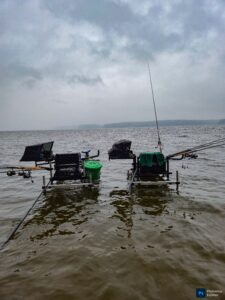 Sekmadienis – antroji varžybų diena. Ji pasitinka mus visai kitomis oro sąlygomis: lietus, debesuota. Pakeliui važiuodami nusprendžiame gaudyti taip, kaip tai darėme paskutines 5 valandas (t. y. pirmosios varžybų dienos pabaigoje). Plačiau šiandien mums šypsosi fortūna traukiant sektorius – sėsim į žymiai fainesnį A7 sektorių. Nors senokai mudu čia žvejoję, bet smagu vien dėl to, kad nėra piktos parandės, kuri viską pjautų. Vėl renkamės dvi distancijas – 44 ir 56 m. Toliau startinis jaukinimas, po kurio jau ties penkta sekunde įtempiant valą karšis užlenkia viršūnėlę! Reikalai įsibėgėja – traukiu aš, traukia kolega! Per pirmąją valandą mano sąskaitoje jau 12 karšių, o kolegos – 3. Regis, bent jau kol kas tokiu pat tempu negali pasigirti kaimynai nei iš kairės, nei iš dešinės.