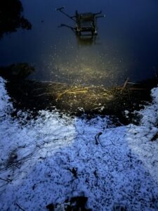 Maniau, kad visi šie sinoptikai žodžiai teliks tuščiu aidu vidur lauko, bet pabundu ryte ir mano akys šokteli kažkur ant kaktos. Pati tikriausia žiema kieme… Sniegooooo (pažiūrėkit į nuotraukas galerijoje). Na bet žvejyba yra žvejyba, todėl jokie tokie juokeliai manęs neprivers mesti kelią dėl takelio. Tvirčiau įsikimbu į mašinos vairą ir su pusiau apjukusiomis mintimis pasileidžiu žūklavietės link.