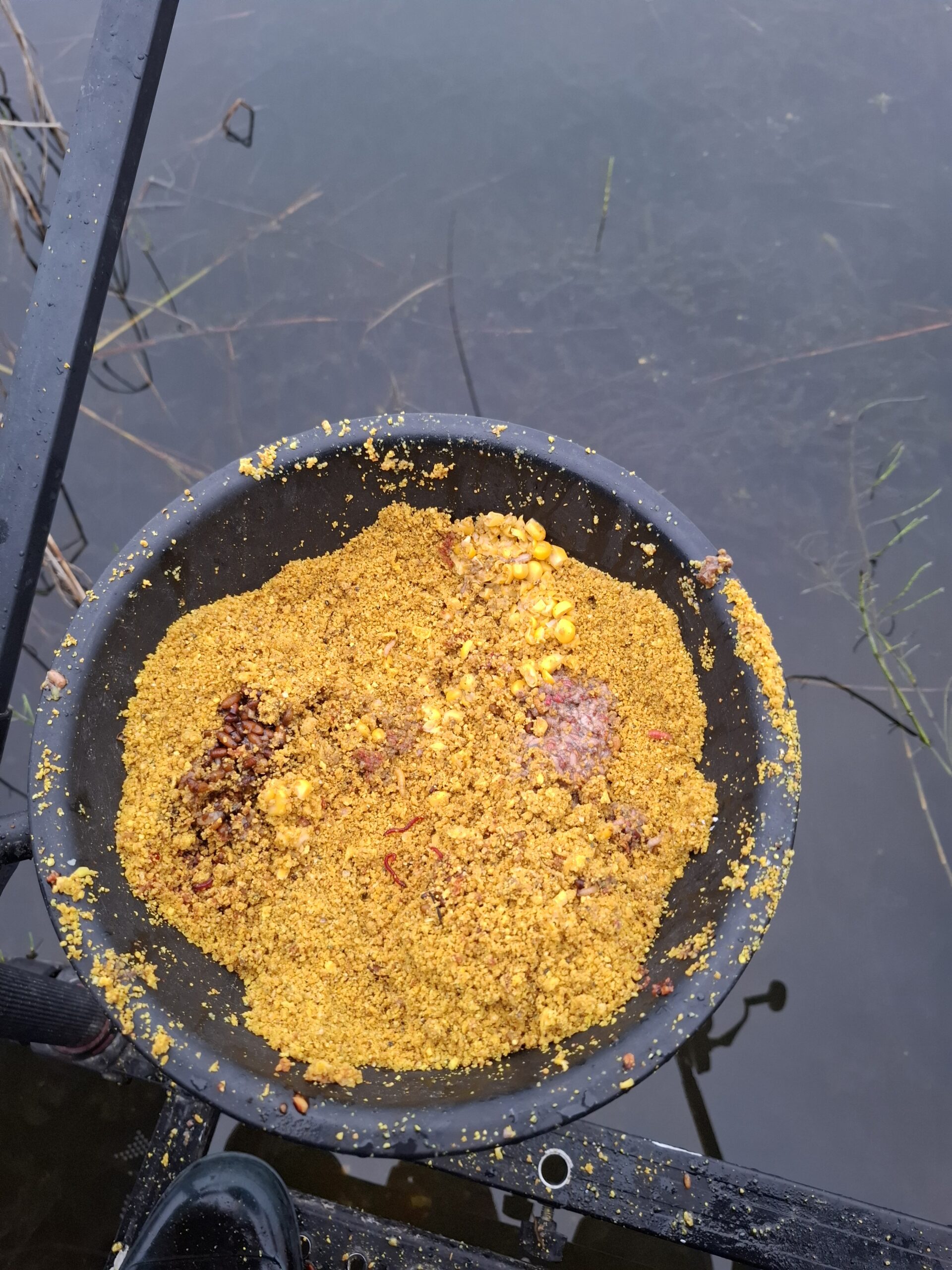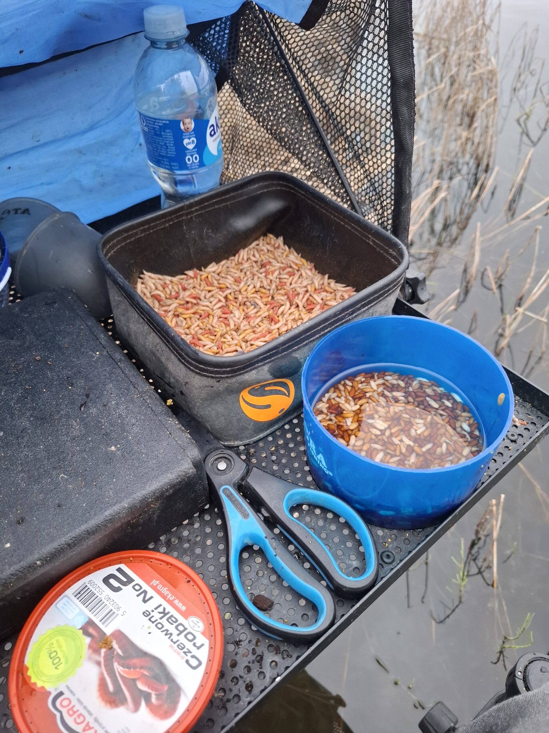 Startui – 8 didelės šėryklos, prikimštos musės lervų košės ir karpytų kukurūzų. Kadangi mano pasirinktas žūklės taškas yra ties pagrindine srove, startuoju su 70 g uždaro tipo šėrykla ir 0,13 mm storio bei 1,5 m ilgio pavadėliu. Pirmos dvi žūklės valandos nieko gero nežadėjo – vien smulkios kuojelės, vienas įskaitinis karšiukas ir puskaršis.