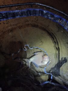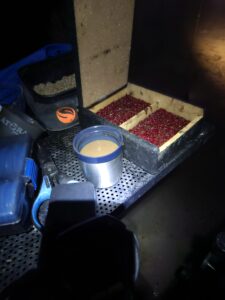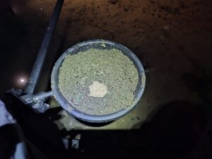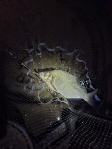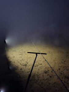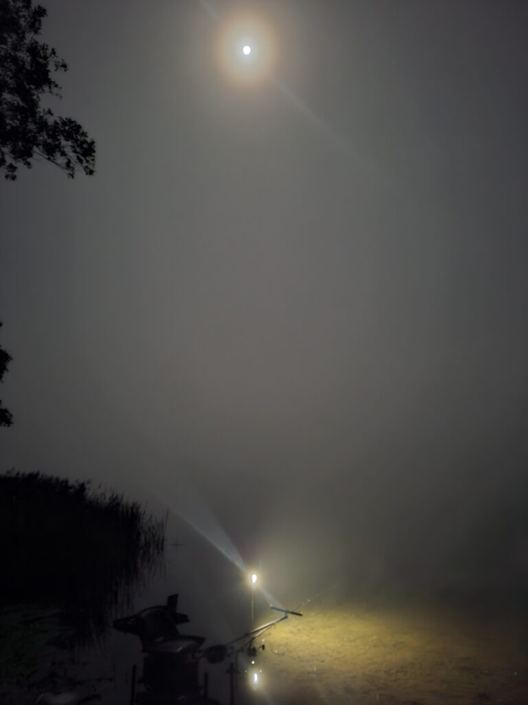 Startiniam jaukinimui – 7–8 šėryklos su tarkuotomis musės lervomis, kurios it kulkos praskrodžia tamsią tolumą ir nežinią. Prasideda laukimas. Per pirmas tamsos valandas pavyksta iškrapštyti porą įskaitinių karšiukų, bet ramybės neduoda mintis, kad kažkas ne taip. Pabandykim užsirišti plonesnį pavadėlį. Pakeičiu 0,117 mm į 0,104 mm ir veiksmas prasideda. Žuvys tampa sukalbamesnės ir viena po kitos pradeda keliauti į krantą. Šį kartą iš skanėstų turėjau tik musės ir uodo trūklio lervų. Pirmąsias dvi valandas po saulės patekėjimo žuvis buvo aktyvi, tačiau vėliau jautėsi, kad ją reiktų kažkuo nustebinti ir suaktyvinti iš naujo. Šį kartą sausi priedai nepadėjo, o, laikrodžiui išmušus 11-ktą valandą, teko baigti žvejybą ir skubėti namolio į kasdienius darbus.