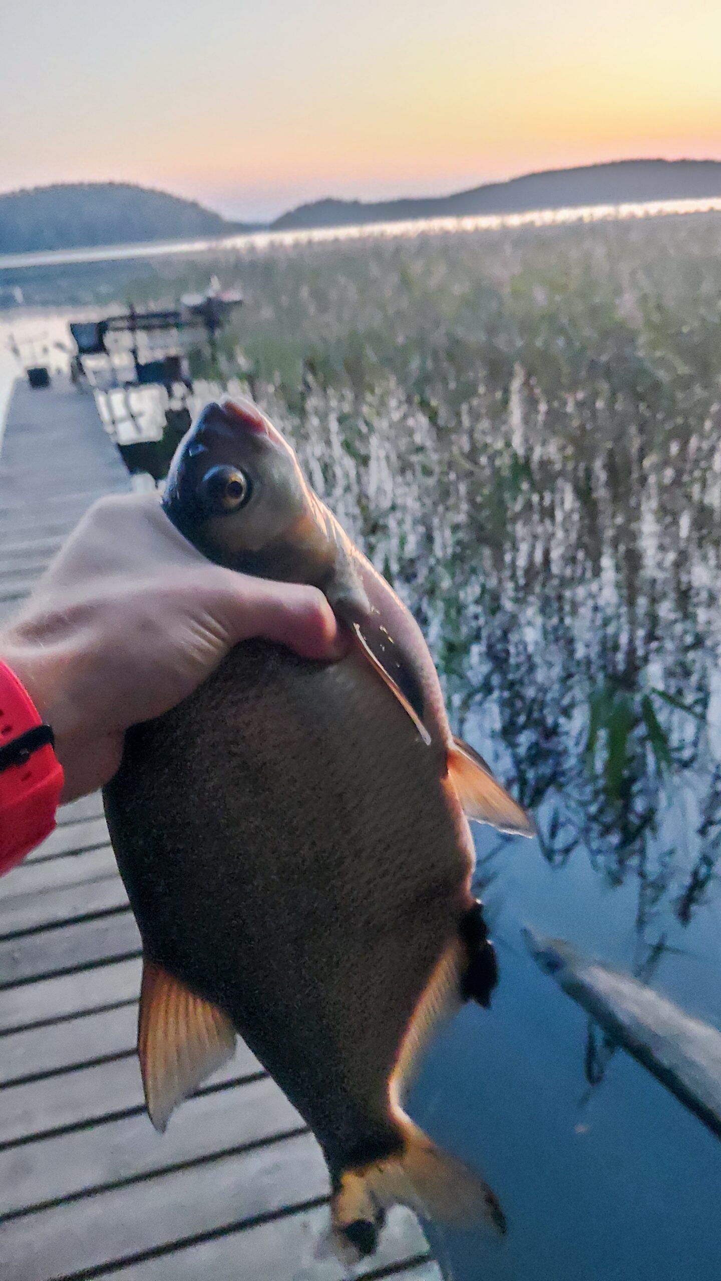 Naktis visiškai rami. Ryte nubudęs, vos tik auštant, išsiruošiau į suplanuotą sportinio feederio sesiją. Čia daug nesiplėsiu, viskas pagal žinomą teoriją – startinis jaukinimas, masalų kombinacijų ant kabliuko paieška, gyvų įtraukimas ir t.t. Visa tai jokios apčiuopiamos naudos nedavė, o sportuoti iš 43m ir gaudyti delno dydžio kuojas visai noro nebuvo. Jos atakuodavo labai greitai, išlaukimas vos iki 2 min. ir žuveliokas ant kablio. Mano tikslas, suprantama, buvo ne toks, todėl grįžtam prie senosios hidbridinės sistemėlės ir laukiam… Tuo tarpu aš po ~3h sesijos susirangau į hamaką ir jau buvau pradedąs sapnuot, tik staiga – pradėjo kaukti signalizatorius!!! Pagal garsą girdžiu, kad kibimas rimtas – cypia be pertraukų. Pribėgęs čiumpu meškerę ir op – jaučiu žuvis stambi! Keli apsukimai, po kurių tampa aišku – tikrai karšis, jo niuksėjimo nesupainiosi su niekuo. Žuvį pavyko sėkmingai perkelti per parandę ir įveikti žolių barjerą. Į paviršių visų gražumu iškilo ilgai lauktas plačiašonis. Tikrai graži žuvis, didelė, iš akies ~2kg ( vėliau buvo pasvertas – 1.9kg ). Greita nuotrauka, žuvis į sietelį ir greičiau permetam. Gal atplaukė koks didesnis būrelis! Permetus, ilgai netrukus vėl gražus kibimas. Pagal pojūtį dar stambesnė žuvis, tačiau šį kartą nesėkmingai… Greičiausiai per daug forsuodamas per žoles išplėšiau kabliuką iš lūpos… Po šių dviejų gražių kibimų prasidėjo tikras chuliganiškas kibimas. Tai rečiau, tai dažniau pradėjo kabaliotis raudės. Sakysit, kas čia tokio? Nustebęs buvau vien dėl to, kad dugnine gaudyti raudes man kažkas naujo, o dar tokiam gylyje? Tiesa ir „išmiera“ jų labai buvo džiuginanti, smagu tokias traukti, kai didžioji dalis ūgtelėjusi iki 0.5kg ir daugiau. Taip ir praslinko antroji žvejybos para galynėjantis su ežero chuliganėmis, žiežulomis, raudėmis – jas vadina visi skirtingai, bet faktas tas, kad jos piktos ir agresyvios. Galop vakarinis papildomas jaukinimas – 2kg žirnių, 1kg kviečių ir 2kg kukurūzų. Po jaukinimo iki sutemstant pavyko pasigauti dar du karšelius po 1kg+, o žiežulos ir toliau nedavė ramybės, net naktį kelias pavyko pagauti.