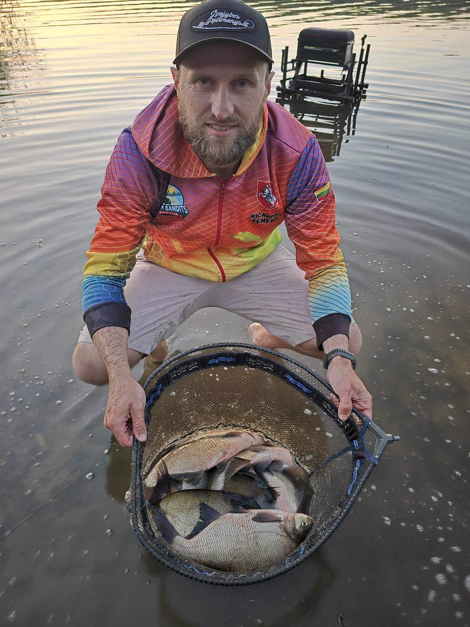 Jau šiek tiek didesne viltimi pradedu jaukinti artimąjį tašką (tolimojo klipsą, dėl viso pikto, palikau ant kitos meškerės). Vėl didieji sviediniai, vėl karpiniai, vėl masalų kombinacijos. Na ir ką, sprendimas pasiteisino. Po vos įžiūrimo kibimo (labai jau didelis šoninis vėjas buvo), pasisveikinu su vietiniu puskaršiuku (net ne puskaršiu). Pirmas, antras, trečias… Širdis ima plakti ramiau, regis, einu teisingu keliu. Nors sunkiaatlečių nėr, bet veiksmo yra (o bonusiukas gal vienas kitas prašoks).