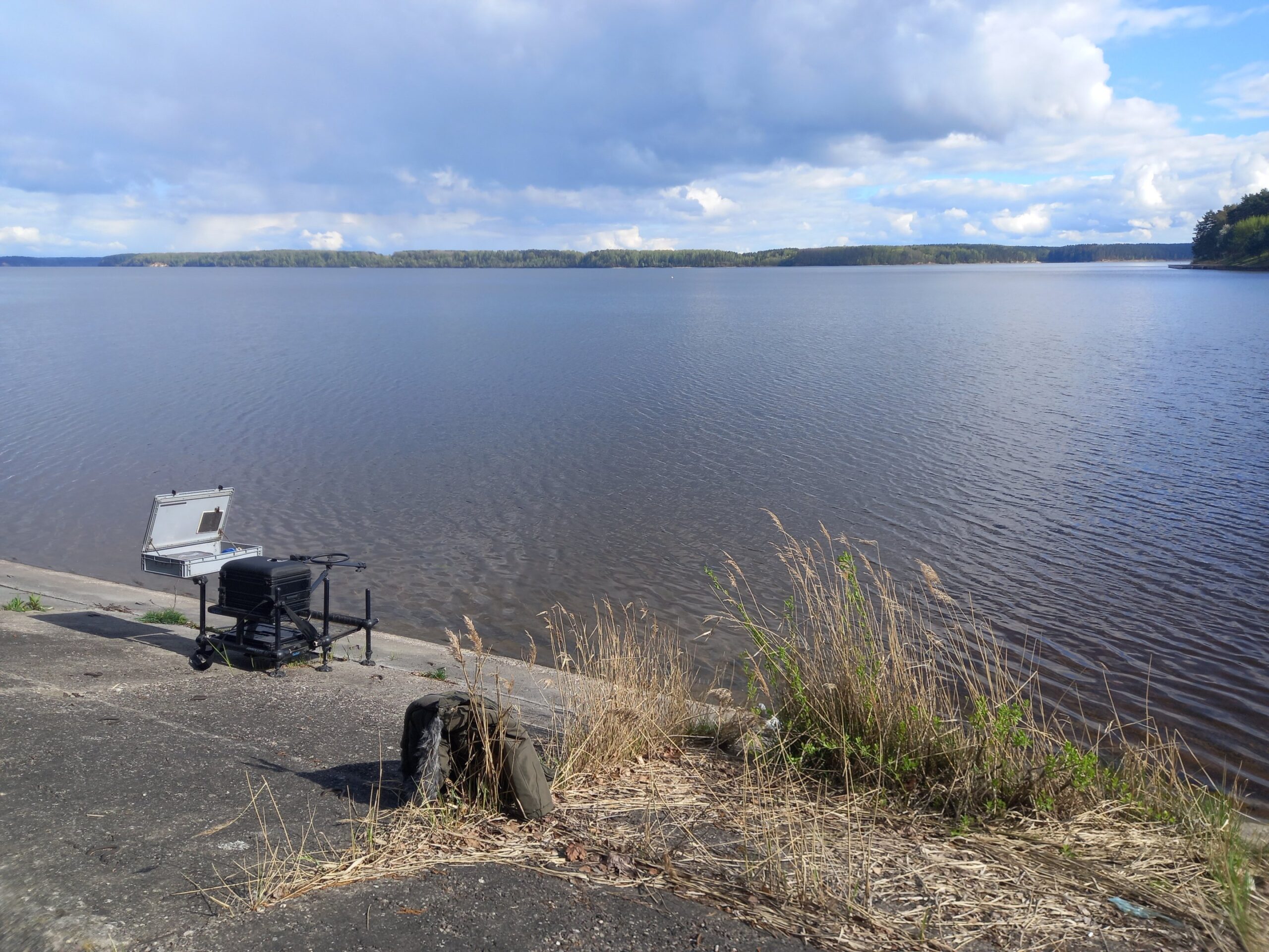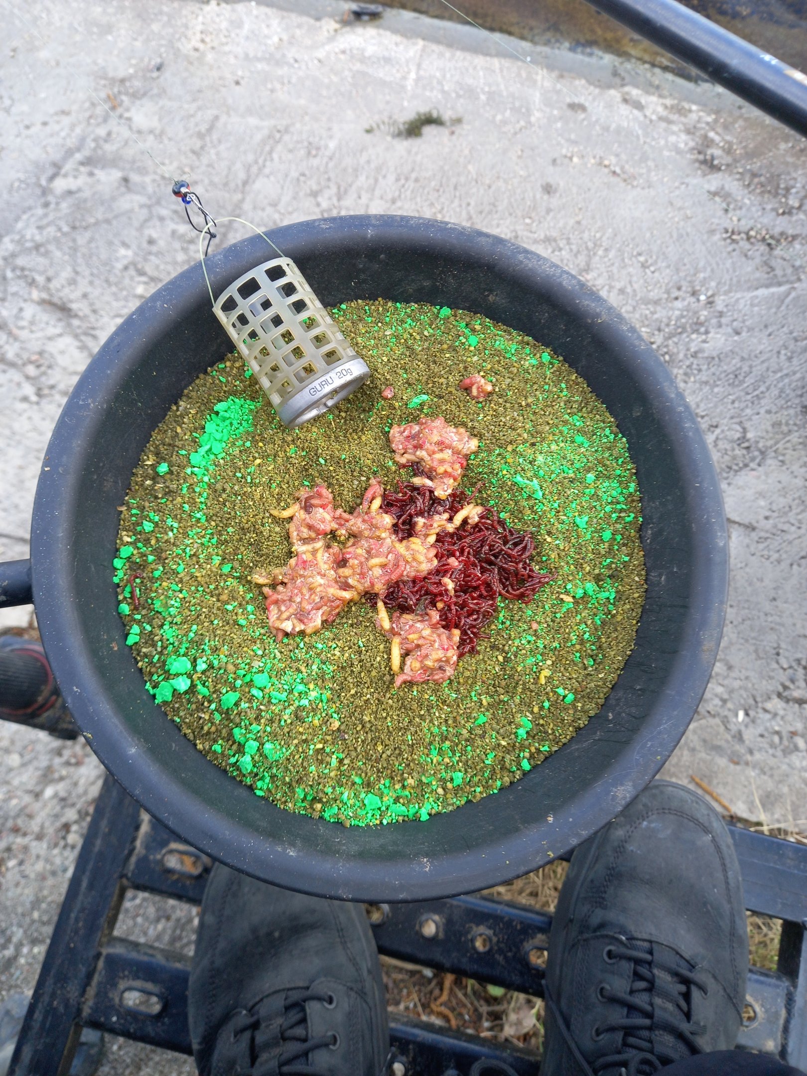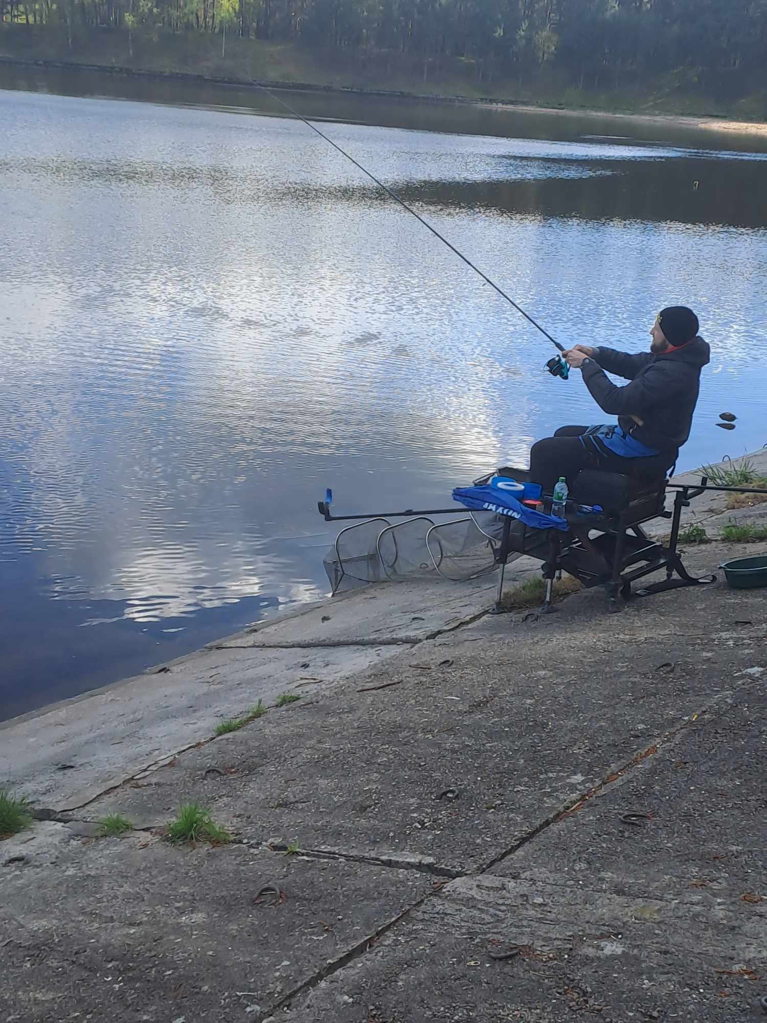 Startavau su 0,1 mm storio ir septyniasdešimties centimetrų ilgio pavadėliu, papuoštu 12 numeriu A1 kabliuku. Žvejybos eigoje eksperimentavau ir išbandžiau 1 m ir 1,2 m ilgio pavadėlius su 14 ir 16 numerio kabliukais, bet didelio skirtumo nepajutau. Kadangi gaudžiau 65 m atstumu, pasirinkau 50 gramų Preston šėryklą-kulką, kuria be didesnių problemų buvo galima pasiekti tolimąjį tikslą. Startiniam jaukinimui nuskraidintos 5 didesnio tūrio šėryklos su gan gausiai praturtintu karpinių pagardu.