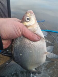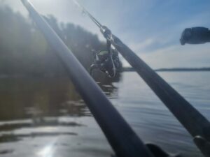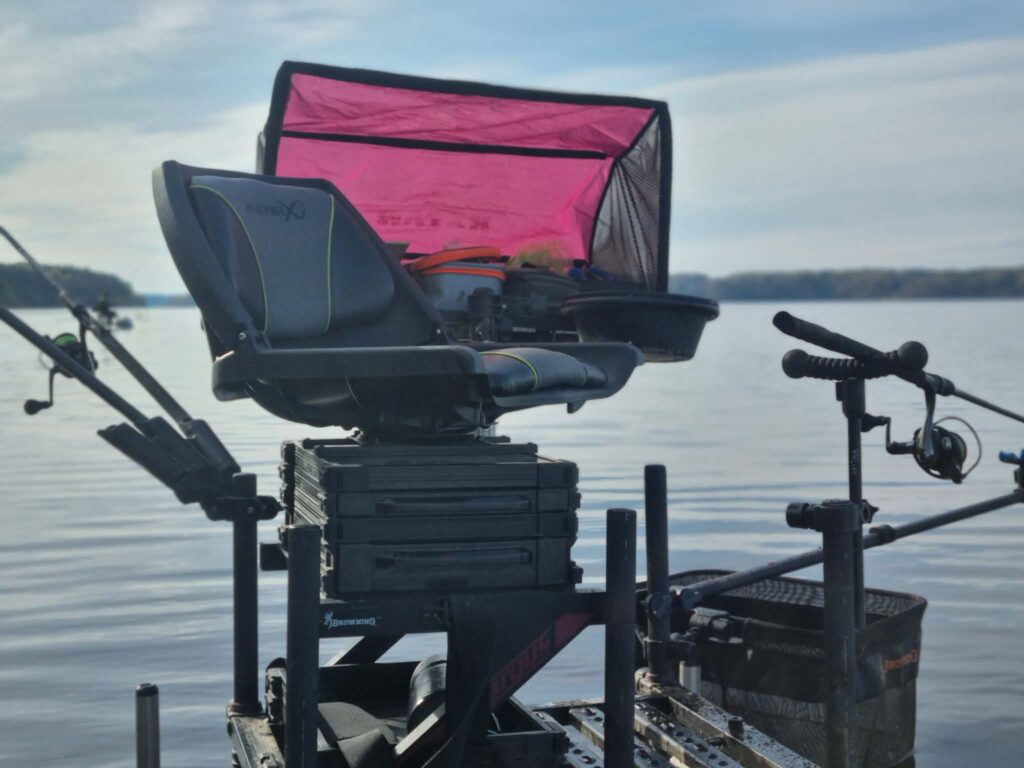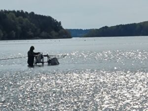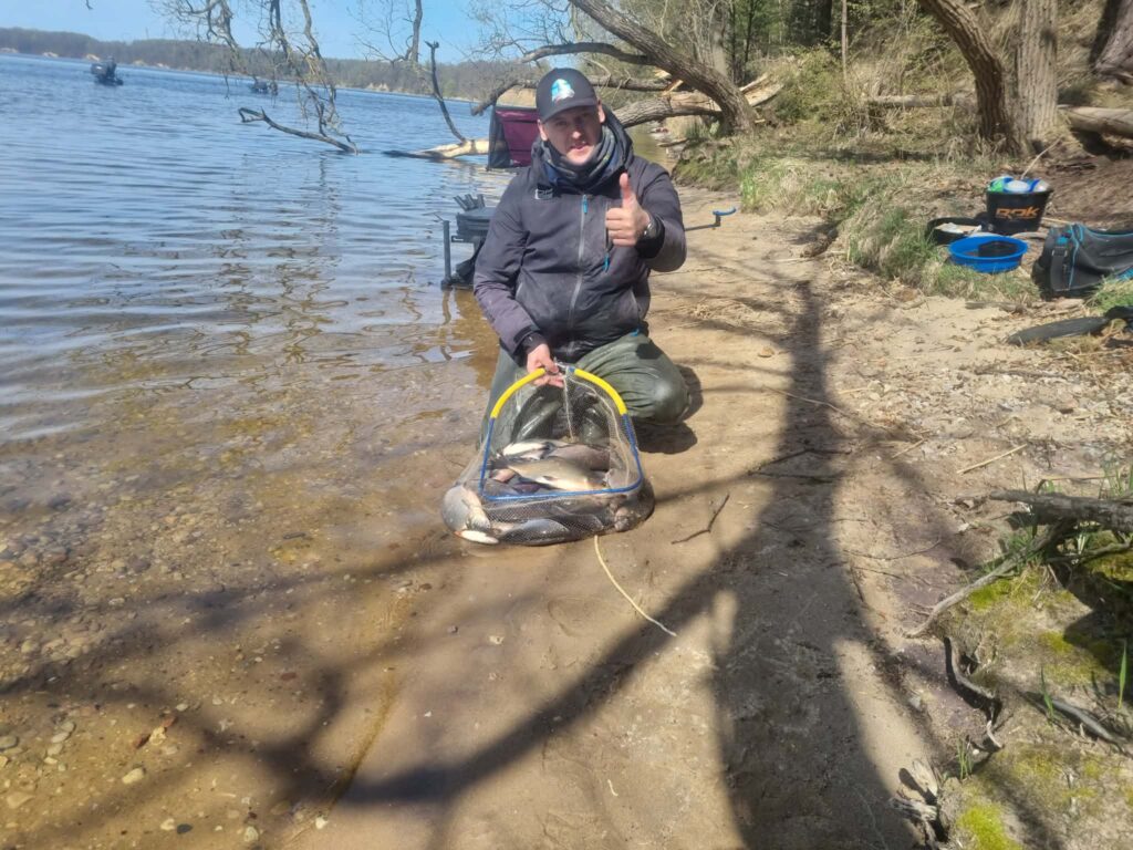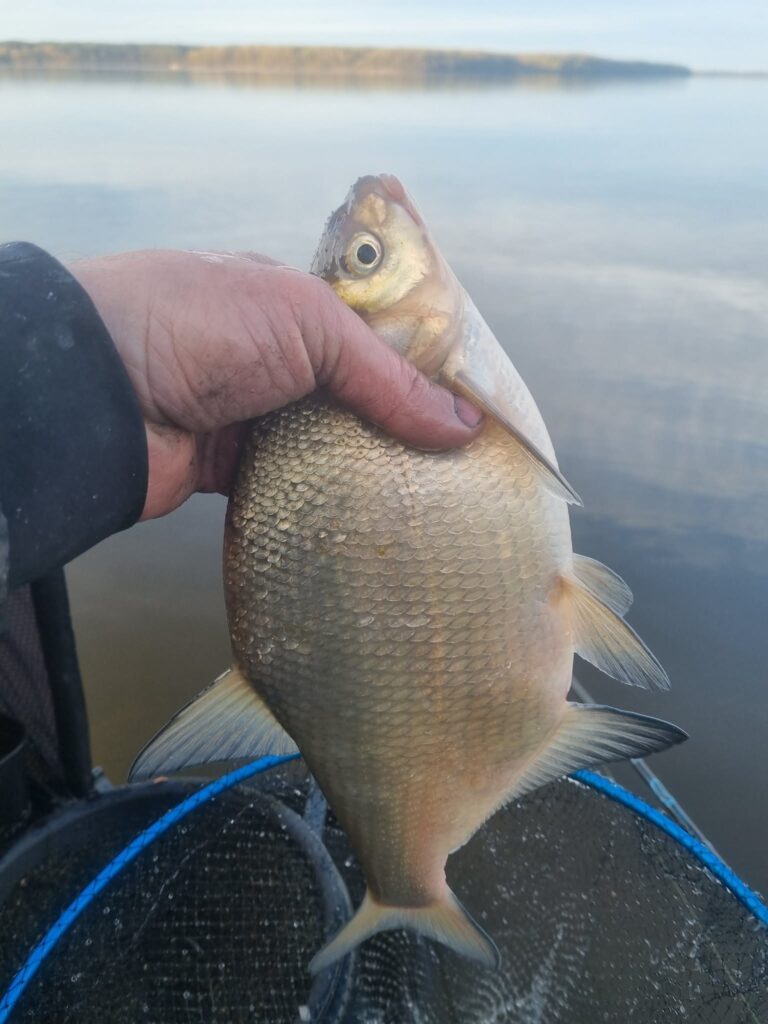 Na bet pakaks skųstis. Žodžiu, ties Neveronimis buvau apie penkias ryto. Vos juntamas vėjelis, rytinė vėsa ir savo nosis vandens paviršiuje kaišiojančios žuvys. Galiu tik pakartoti, kad jau važiuodamas į šią žūklę gyvenau nuojauta, kad šiandien reikalai klostys gerai. Taip ir buvo. Startavau šeštą – pradžiai geros penkios šėryklos, pakamšytos skandintomis musės lervomis. Žvejojamas atstumas itin patogus – vos kiek virš 20 metrų. Gylis taip pat simpatiškas – apie aštuonis metrus. Kitaip sakant, sportinė žūklė dugnine meškere pačiu tikriausiu ir smagiausiu savo pavidalu. Čiumpu į rankas savo 3,6 m. Browning Sphere kotelį (kurį daugelis yra praminę „šperomis“) ir siunčiu pirmuosius linkėjimus žuvims su keletu musės lervų ir trūklių. Atsakas greitas ir konkretus. Neišlaukiu nė minutės, kaip kabliuką pirmoji čiumpa delninė kuoja. Nors žuvis pirmu metimu – blogas ženklas, tačiau nuojauta, apie kurią jau minėjau ne kartą, leidžia į visa tai reaguoti ramiai. Po to seka delninis karšiukas, tada vėl kuoja… Chronometras buvo nustatytas trims minutėms, tačiau, nesumeluosiu, per visas šešias žūklės valandas šis laiko limitas ištiksėjo gal kokius penkis kartus. Žuvis po žuvies… Iš tokio gero gyvenimo galvoje pradėjo suktis mintys apie būdų stambesnei žuviai gaudyti paieškas. Bandžiau stambinti masalus, gausiau pakamšyti šėryklėlę, tačiau visi dienos standartai neperkopė kilogramo ribos. Matyt, didžiųjų karšių kaimenės pasuko neršto reikalais, o nuo kranto pasiekiamu atstumu šmirinėja tradiciniai Kauno marių puskaršiai. Kaip ten bebūtų, traukti tokius lengvu įrankiu taip pat labai smagu, o ir įskaitinių galvų (virš 700 gr. svėriusių) šiandien priskaičiavau septynias. Iš viso sugauti 56 žuveliokai – daug tai ar mažai (per šešias žvejybos valandas), spręskite jūs. Man jų plačiai šypsenai iki ausų tikrai pakako.